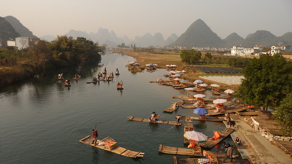 Früh am Morgen unseres dritten Tages stiegen wir in einen Touri-Bus, der uns nach Yangshuo bringen sollte. Unser Reiseführer stellte sich mit dem einprägsamen Namen „KFC“ vor, mit der schlagfertigen Begründung, das seine Lieblings-Fastfood-Kette überall den gleichen Qualitäts-Standard bietet. Das konnte ja nur gut werden. Wir düsten nämlich nicht nur geradewegs zum nächsten Bestimmungsort, sondern hielten auf halben Weg in einem Dorf am Li-Fluss an, der von Guilin nach Yangshuo fließt. Hier stiegen wir an jeweils zu viert auf ein Boot, das aus ein paar langen, hohlen Plastikrohren und einem kleinen Sonnenschutz zusammengebaut war. Nachdem wir vom Ufer abgelegt hatten, bot sich uns zum ersten Mal die Gelegenheit, die überwältigende Landschaft der Region Guangxi zu bewundern.