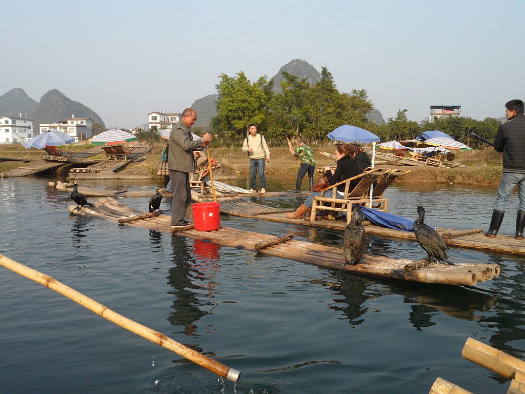 Anschließend durften wir in der Nachmittags-Sonne eine kleine Bambus-Floßfahrt antreten, diesmal auch tatsächlich auf einem Boot, das nur Platz für zwei Personen bot und ausschließlich aus ein paar Bambusstangen angefertigt war. Während unser Steuermann sachte immer wieder einen langen Bambusstab auf den Flussgrund stieß, sahen wir einem Fischer zu, der einige effiziente Gehilfen ausgebildet hatte: drei Kormorane halfen ihm gekonnt bei seiner Arbeit. Nur noch wenige nehmen die Bürde auf sich, jahrelang einen der großen, schwarzen Vögel zu trainieren, doch angesichts der Tatsache, dass Kormorane täglich bis zu fünfzig Kilogramm Fisch fangen können, lohnt sich die Mühe am Ende vermutlich.