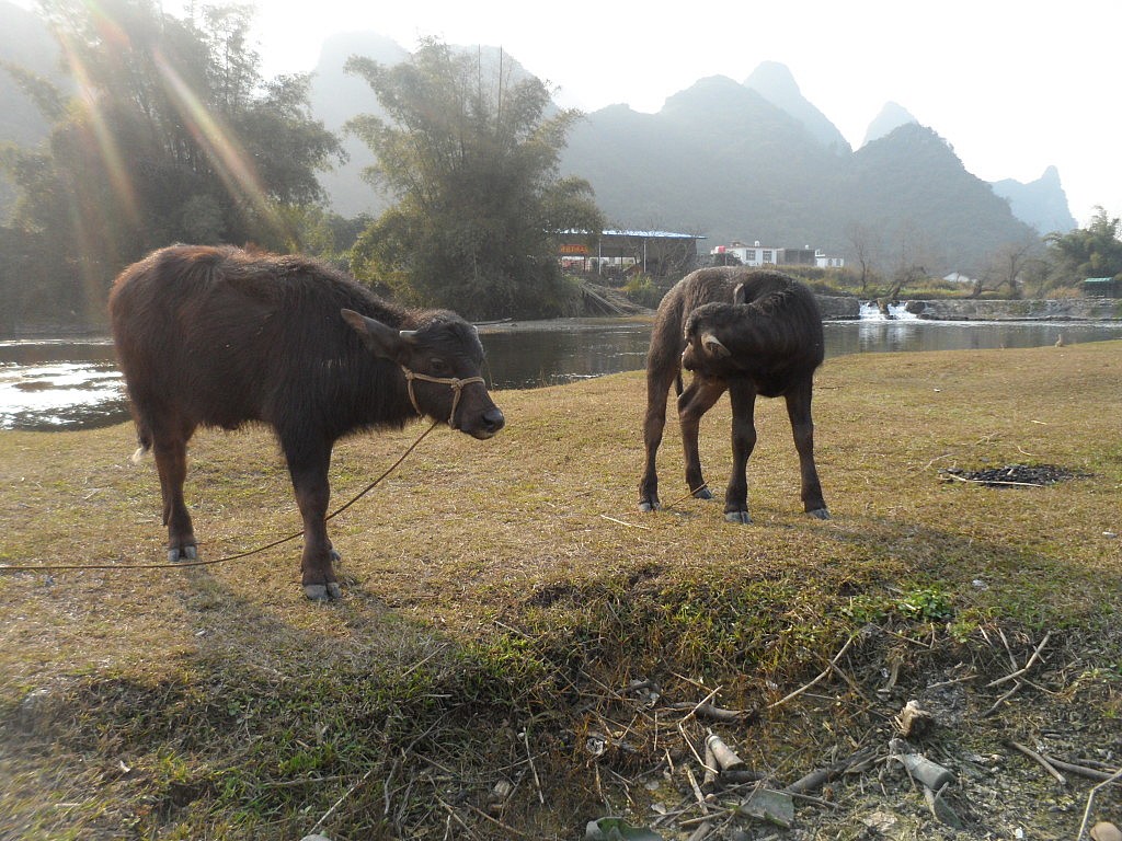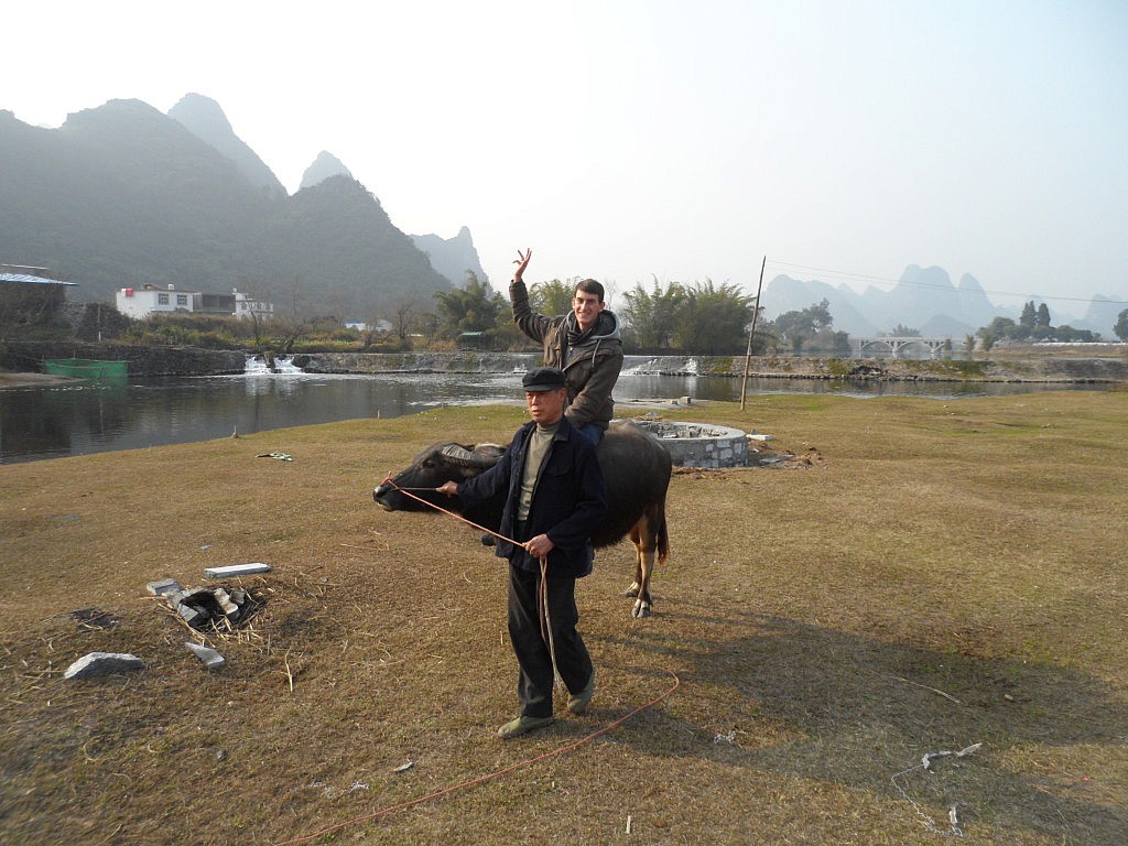 Einen weiteren Gehilfen der lokalen Bevölkerung lernten wir auf einer kleinen Insel imFluss kennen. Dort grasten ein paar Wasserbüffel vor sich hin, die normalerweise bei der Feldarbeit mit anpacken. Den Exemplaren auf der Insel wurde jedoch die höchst ehrenvolle Aufgabe zuteil, Touristen auf dem Rücken herumzutragen. Als ich es ebenfalls geschafft hatte, auf einen der Hufträger zu klettern, begriff ich recht schnell, warum kein mir bekanntes Volk der Welt Kühe als Reittiere nutzte. Auch wenn mir nicht gerade ein Rodeo-Ritt beschert wurde, schwankte man obenauf wie ein Betrunkener und konnte nicht wirklich bestimmen, in welche Richtung der Gute denn jetzt gehen sollte. Wäre da nicht der chinesische Aufpasser gewesen, hätte ich meine Reise vermutlich auf einem Wasserbüffel fortsetzen müssen. Halb so schlimm, denn man konnte einfach nicht anders, als die gemütlichen Riesen mit den langen, geschwungenen Hörnern und den treuherzigen dunklen Augen ins Herz zu schließen.