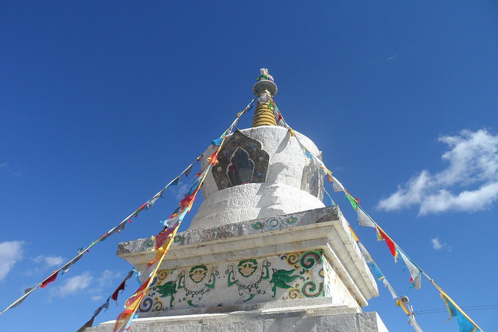 Unter strahlend blauem Himmel wanderten wir über die karge, trockene Fläche, die einzigen Menschen weit und breit, nur begleitet von einer stetigen, frischen Brise kristallklarer Luft und den hin und wieder vorüberziehenden Schatten der Wattebausch-förmigen Wolken. Zugegebenermaßen, ganz alleine waren wir auch wieder nicht, denn irgendwoher mussten die in rauen Mengen herumliegenden Pferdeäpfel ja kommen. An und in einer Ansammlung von kleinen, flachen Seen grasten friedlich dutzende Ponys, die sich von uns überhaupt nicht stören ließen. Nachdem wir ein paar riesige, an Klappstühle erinnernde Holzkonstruktionen (vermutlich zum Trocknen von Stroh) passiert hatten, überquerten wir einen Hügel und standen unverhofft in einem hauptsächlich von Mitgliedern der tibetischen Minderheit besiedelten Dorf.