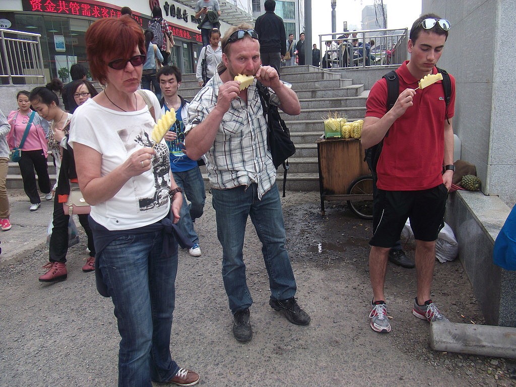 Dank meiner minimal verschobenen Entfernungswahrnehmung erhielten wir auf der anderen Seite die Gelegenheit, einmal richtig in das quirlige Leben auf den Straßen Wuhans einzutauchen. Kleinkinder, die mit geöffneten Po-Klappen fröhlich über den Asphalt robben; Tante-Emma-Laden-Besitzer, deren Gesichter beim Anblick des vorbeimarschierenden Laowai-Trupps noch mehr Falten schlagen, als sie sowieso schon haben; Obstverkäufer, die ihre süßen, kunstvoll geschälten Ananas-Spieße feilbieten; Mini-Modeboutiquen, aus denen dauerhaft grausame chinesische Techno-Hymnen erschallen; tausend verschiedene Düfte aus jedem Hauseingang (und leider auch aus jedem Gulli-Deckel) – ein einfacher Gang von einem Ziel zum nächsten kann manchmal genauso spannend sein wie eine offizielle Touristen-Attraktion.