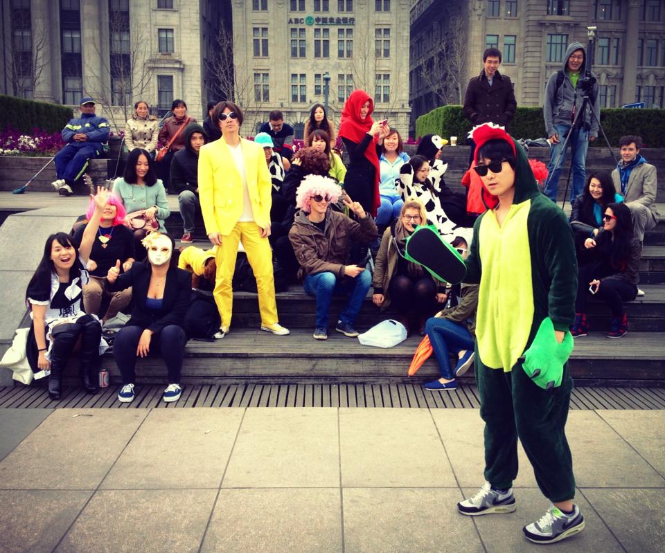 Einen richtig intensiven Tag erlebte ich allerdings erst am folgenden Morgen. Alles begann mit zwei wunderschönen Sonnenbrillen und einer pinken Perücke, die Lien und ich in einer Shoppingmall ersteigerten. Mit diesen im Handgepäck und Theresa, die während unserer seltsamen Einkaufstour ebenfalls in Shanghai eingetroffen war, zogen wir los zum Bund und hielten dort Ausschau nach anderen Leuten, die ähnliche Accessoires bei sich trugen. Da, ein Hund im Pullover! Zu wem der wohl gehören mochte? Zu den Gestalten, die alle irgendwelche ominösen Taschen bei sich trugen! Hier waren wir richtig! Und unser gemeinsames Motto, das uns alle für eine kurze Zeit zusammenschweißte, lautete: „We do the Harlem Shake!“
