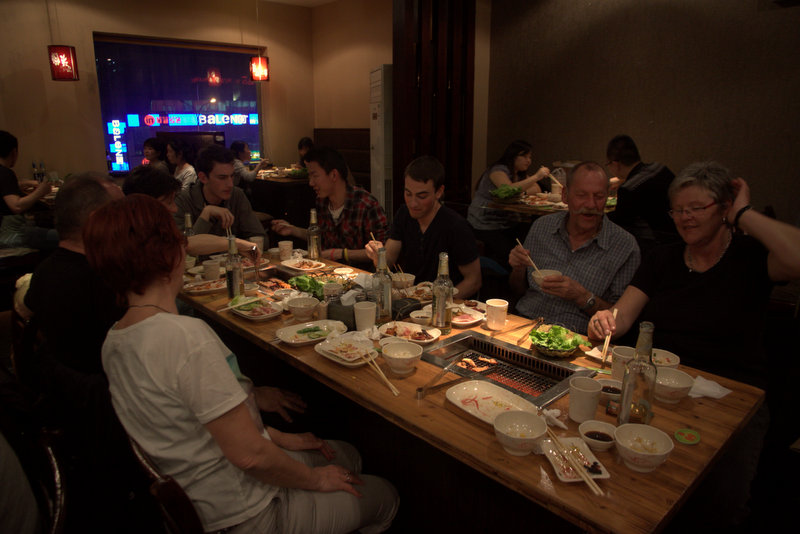 Trotz allem brachte ich es irgendwie auf die Reihe, meinen sieben Gästen zu zeigen, welche Details bei all dem Durcheinander und der Hektik dennoch dafür sorgen, dass es mir hier so gut gefällt. Zum Beispiel, wenn beim Korean Barbeque tonnenweise Bacon und Shrimps auf dem Grill brutzeln. Wenn der Dry Hot Pot verführerisch auf dem Tisch vor sich hin blubbert. Wenn man über einen dampfenden Haufen frisch geschlagener Nudeln in einem der garantiert guten muslimischen Restaurants herfällt. Wenn man einen durchaus genießbaren Pott Kaffee in der Tan Hua Lin schlürft, währenddessen in einem der vielen Skizzenbücher herum kritzelt und das fotografierende Volk belächelt. Oder sogar, wenn man in der Helens Bar einen recht alkoholfrei, aber lecker schmeckenden Cocktail bestellt und sich bis spät in die Nacht von einem Gespräch ins andere treiben lässt.