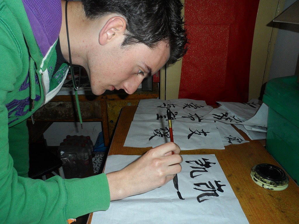 Dieses Mal gab er mir eine Einführung in die chinesische Kalligrafie, eine hohe Kunst, die ich schon immer einmal ausprobieren wollte. Und wieder einmal überschätzte ich mich gnadenlos. Nein, gut zeichnen zu können bedeutet nicht automatisch, dass man zu einer Karriere als Kalligraf prädestiniert ist. Ich fand sehr schnell heraus, dass mehr dazu gehörte als nur eine hübsche Handschrift, um die „Vier Schätze des Gelehrtenzimmers“, Schreibpinsel, Stangentusche, Reibstein und Papier richtig zu benutzen. Für mich erwies es sich bereits als kleine Herausforderung, den Pinsel richtig zu halten, ohne mir einen Krampf im Unterarm zuzuziehen. Während Wang Kai jeden perfekt gezogenen Strich zu einem wunderschönen Zeichen vereinigte, resultierten meine Versuche, ihn zu imitieren, immer wieder in deformierten Krüppeln.