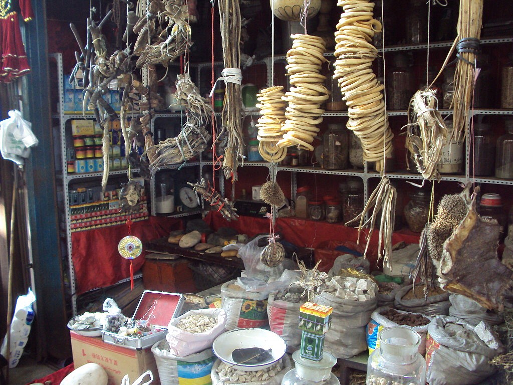 Mit getrockneten Eidechsen, Schlangenhaut und Hirschgeweihen