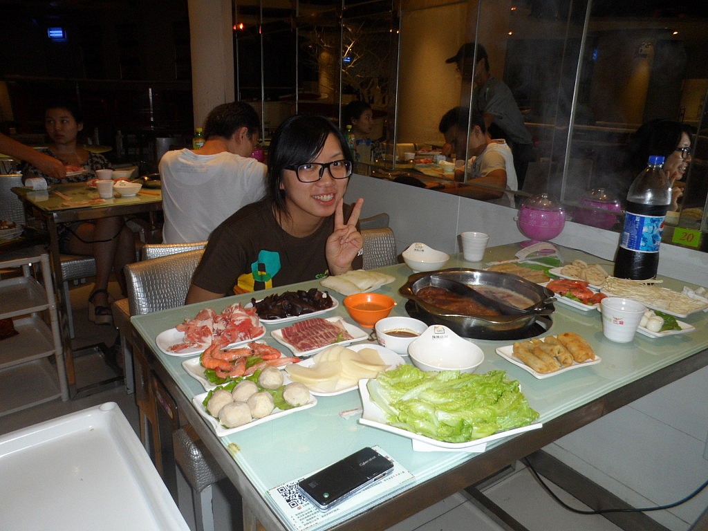 Entspannt wollte ich schließlich zu der Verabredung übergehen, auf die ich mich am meisten freute: ein letztes Treffen mit meiner kleinen großen Schwester Ami, die einzige meiner chinesischen Freundinnen, die noch nicht weitergezogen war. Ursprünglich hatten wir geplant, noch einmal bei der Hu Bu Xiang in einem unserer Lieblingsrestaurants essen zu gehen und den Rest des Abends am Yangtse-Ufer zu verbringen. Leider arbeitete mein Schwesterherz jedoch gerade als Lehrerin in einem Sommercamp, von dem sie sich nicht allzu weit entfernen durfte – ein weiterer Glücksfall, wie sich herausstellen sollte. Also brach ich in die vollkommen entgegengesetzte Richtung zu der großen Shoppingmall mit der Eislaufbahn auf. Natürlich nicht, um ein paar finale Pirouetten zu drehen, sondern um noch einmal einen äußerst reichhaltigen Hotpot zu genießen. Während wir wie immer in lebenswichtigen Diskussionen versanken, blubberten in dem Yin-Yang förmigen Topf vor uns Bambussprossen, Lotuswurzeln, Bacon-Streifen, Mu-Er-Pilze, Wachteleier und selbstverständlich Garnelen, mein in diesem Jahr entdecktes Lieblingsmeeresgetier.