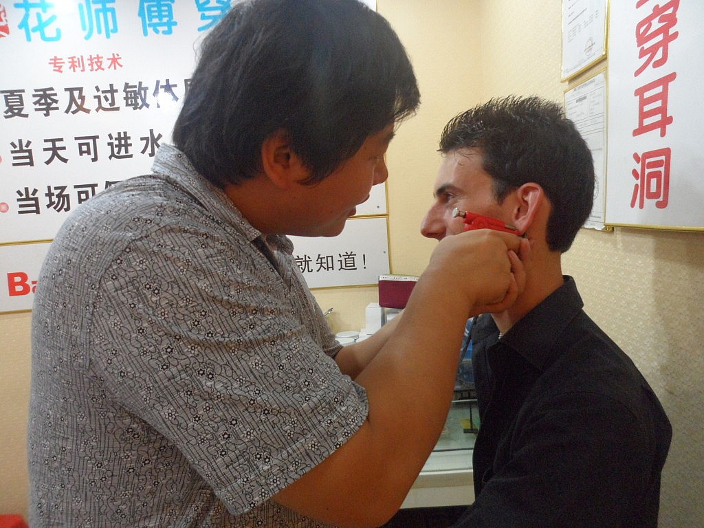 Vollkommen vollgefressen erinnerte ich mich dann an einen Plan, den ich schon vor Längerem in die Tat umsetzen wollte, aber es irgendwie nie auf die Reihe gebracht hatte. Nun schien jedoch der richtige Zeitpunkt gekommen zu sein: wir befanden uns mitten in einem riesigen Shoppingcenter, in dem es alles gab, was das Konsumentenherz begehrt. Also musste es hier auch irgendwo einen Ort geben, an dem man sich einen Ohrring stechen lassen konnte! Fragte sich nur, wo man den unter fünfhundert Läden finden sollte, die sich in einem unübersichtlichen Labyrinth von Gängen aneinanderreihten. Ich wollte schon die Hoffnung aufgeben, als uns endlich eine nette Verkäuferin einen heißen und ich daraufhin endlich vor einem winzigen Laden irgendwo im hintersten Eck stand.