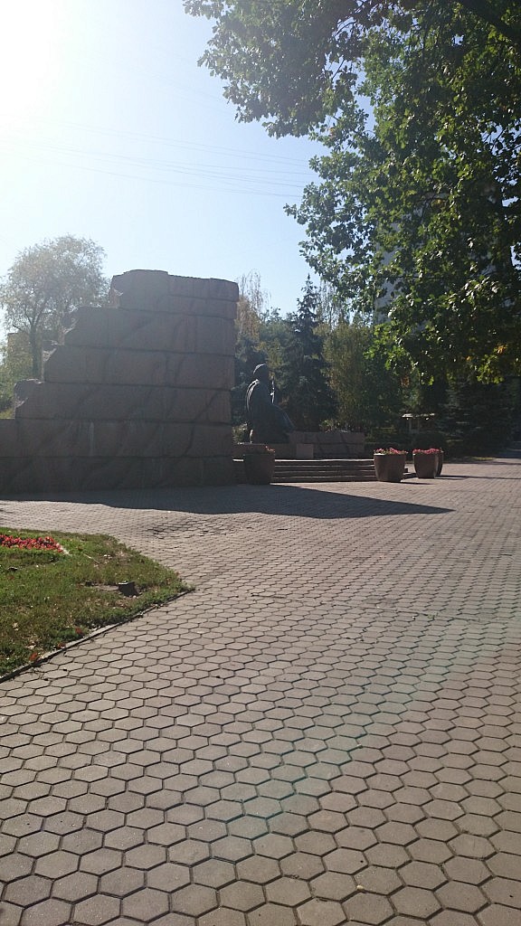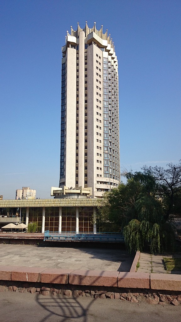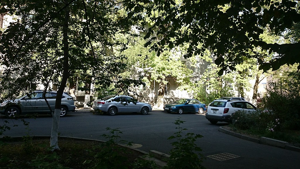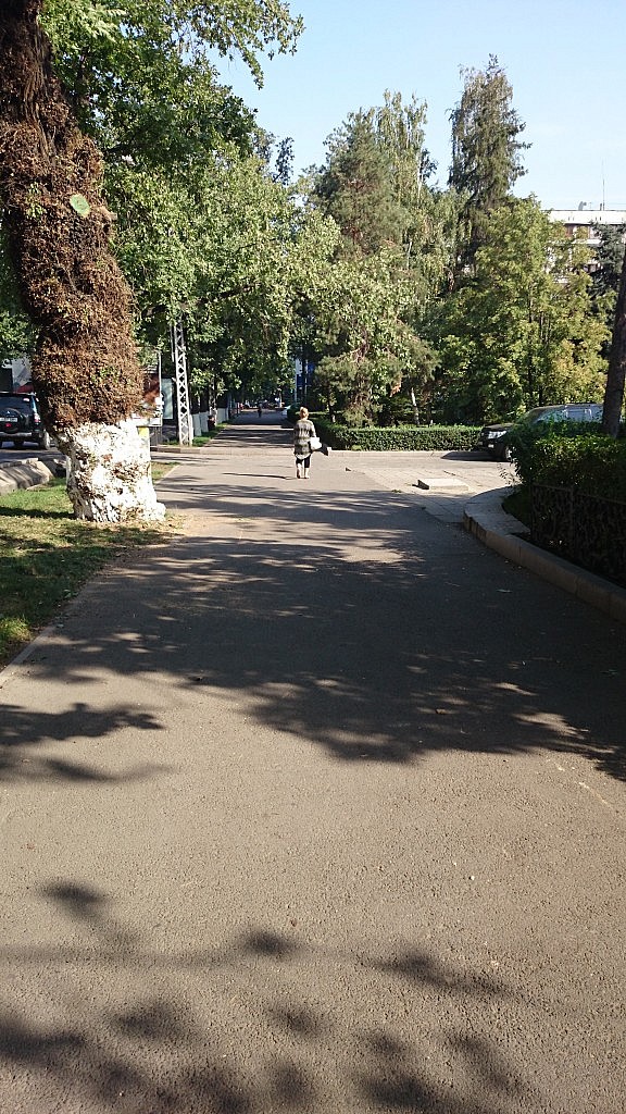Hier arbeite ich. Almaty ist (zumindest noch) sehr gruen. Die Alleen sind klasse und spenden Schatten aehrend des heissen Wetters.