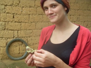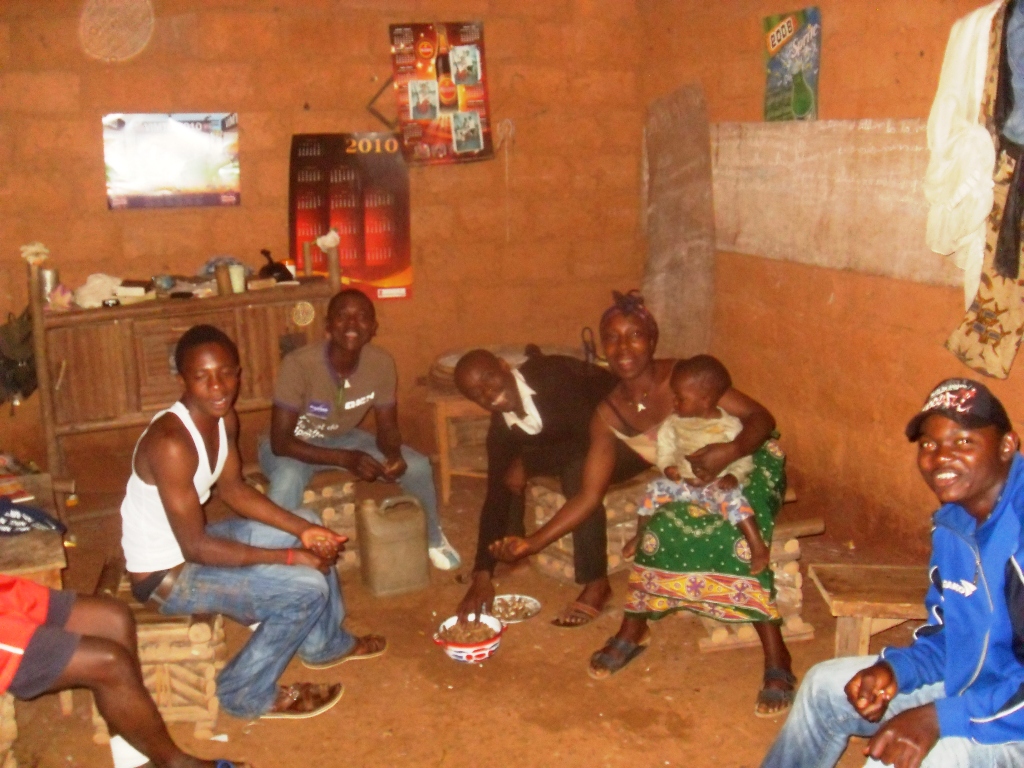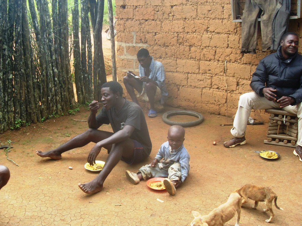 Auto einen wahnsinnigen Umweg fahren müssen. Die Lösung? Mit einem großen Reiserucksack ein Motorrad nehmen, das auf einem Trampelpfad immer zwischen und an den Gleisen entlang bis nach Koumba fährt. Die Zwischenfrage meines Motorradfahrers, ob ich mir Sorgen mache, weil doch ein Zug kommen könnte, konnte mir dann auch nichts mehr anhaben. So kam ich nach einem gesamten Tag Zugfahrt schließlich erschöpft und vor allem verstaubt in Koumba an. Nach einem Tag viel Sonne, viel Staub und viele Mücken ging die Fahrt dann schließlich weiter nach Bafoussam, der Hauptstadt der Westprovinz. Dort kannte ich mich inzwischen aus, wollte auch nur eine Nacht Zwischenstation machen, bevor es am nächsten Morgen weiter nach Bangangté ging, eine Stunde südlich von Bafoussam. Dort wollte ich mich mit einem Freund treffen, mit dem ich zusammen in sein Dorf Bazou fahren und dort ein bisschen Abstand von jeder Großstadt finden wollte. Ich hatte also das Glück als vermeintliche Ehefrau in das Dorf einzureisen, was mir sofort jedes Tor und Tür öffnete. Der Empfang war unendlich herzlich und ich sollte in den zwei folgenden Tagen diese Leute unheimlich schätzen lernen. Wir übernachteten die Tage im Haus des Onkels – ein reiner Männerhaushalt. Ein reines Abenteuer. Ohne fließend Wasser, Wasser wurde im 5km weit entfernten Fluss geholt. Nur dass Männer offensichtlich weniger Bedarf an Wasser haben. Aber ich passte mich an. Uns wurde eins der beiden Zimmer des Hauses zur Verfügung gestellt, die anderen fünf Personen des Haushalts zwängten sich auf die andere Matratze.
