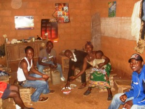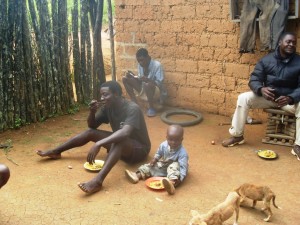 Das Dorfleben (siehe Fotos) bietet überhaupt neben Jagd und Landwirtschaft wenig Abwechslung. So wird ein Großteil des Tages damit zugebracht, Palmwein zu trinken und zu diskutieren. Wasser zu trinken, kennen die meisten nicht, sie bleiben lieber beim Palmwein. Nach ihrer Auffassung macht der ja auch nicht betrunken. Dafür sind die Leute aber doch die ganze Zeit ganz schön beschickert. Mann und Frau leben recht getrennt ihren Alltag. Die Frauen in der Küche, die Männer auf der Jagd und beim Palmwein. Wobei die Frauen dabei auch nicht nachstehen, sie sind der Überzeugung, dass sie dadurch so schöne Kinder haben.