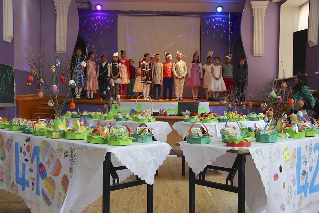 Also nichts wie los, dachten wir Anfang April. Die Kinder bemalten wunderschöne Ostereier in ihren kurzen Frühlingsferien, bastelten Osterhasenohren und wir suchten nach unzähligen Osterliedern. Nach den Ferien habe ich mit meinen Zusatzstunden für die Deutschschüler begonnen und ihnen mit einem kleinen selbst erstellten Osterbuch, Ostern ein wenig näher gebracht. Da die Mongolei ein buddhistisch geprägtes Land ist, steht Ostern sicherlich nicht auf der Feiertagsliste und die Kinder waren sehr gespannt, etwas über das Osterfest in Deutschland zu erfahren. Wir lernten viele Oster- und Frühlingslieder, wie „Stupps, der kleine Osterhase“ und den „Frühlingskanon“, welchen wir mit 68 Kindern, auch wirklich als Kanon, einübten. Eine wirkliche Herausforderung, am Ende klang es aber wirklich super!