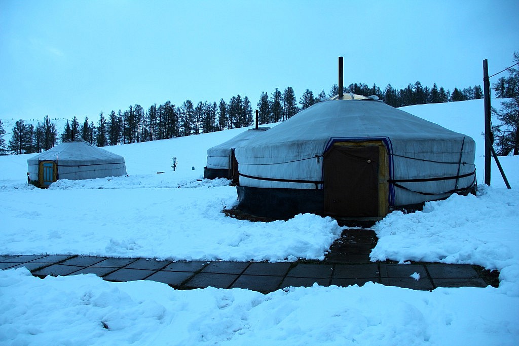 Pustekuchen. Als wir Erdenet erreichen, stecken wir schon mitten im Schnee. Gemeinsam mit den beiden Deutschlehrerinnen aus Erdenet fahren wir weiter in das Jurtencamp, wo wir das Wochenende verbringen werden. Inzwischen ist es Dunkel. Es schneit ununterbrochen. Es kommt mir vor, als hätten wir bereits die russische Grenze überquert und fahren mitten durch Sibirien. Wir erreichen das Jurtencamp. Es ist tatsächlich alles zugeschneit. Die Lehrerinnen überlegen das Camp abzusagen. „Was sollen wir in dem Schnee nur machen?“ Aber nein, die Schüler freuen sich so sehr und wir uns natürlich auch. Naja gut, dann machen wir uns eben einen gemütlichen ersten Abend in unserer Jurte. Eine Jurte ist ein wirklich schöner Platz, wenn es draußen so kalt ist und man drinnen gemütlich um den Ofen sitzen kann. Die Ruhe vor dem Sturm. Die Kinder kommen am nächsten Morgen. Dann ist es vorbei mit der „Lagerfeuerromatik“ in der Jurte.