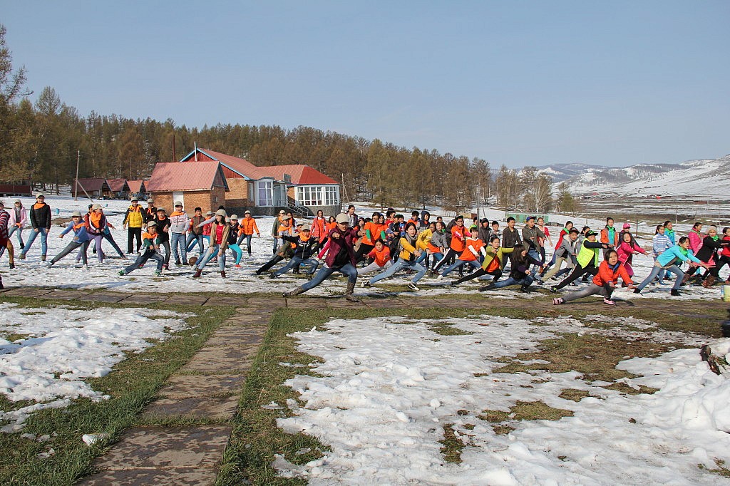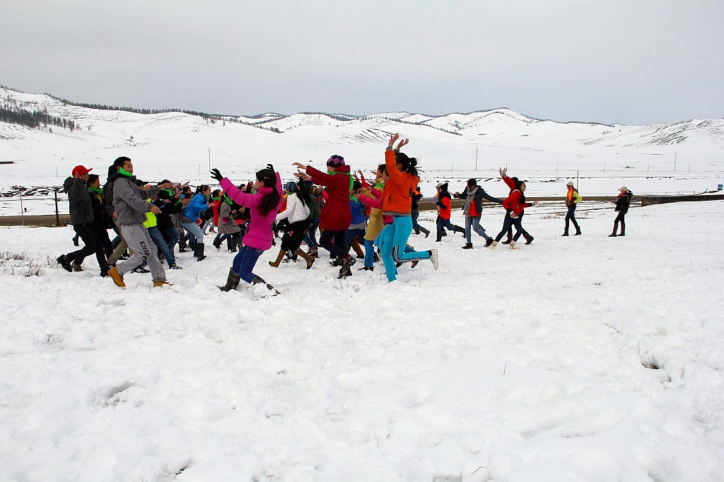 Trotz der „wilden Party“ und der langen „Jurtengesprächen“, die bis in den frühen Morgen zu hören sind (wie das eben so ist, auf Klassenfahrten), laufen die ersten um 6 Uhr morgens schon topfit durch die Gegend. Ich drehe mich aber lieber nochmal um und genieße den Schlaf. Gegen 8 Uhr verlasse ich die Jurte und siehe da, der Schnee taut. Frühsport machen wir noch im Schnee, was so manche Aerobicschritte, welche die mongolischen Jugendlichen alle bestens beherrschen, erschwert.