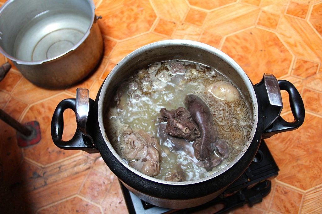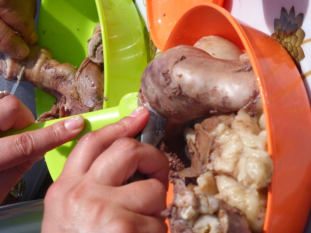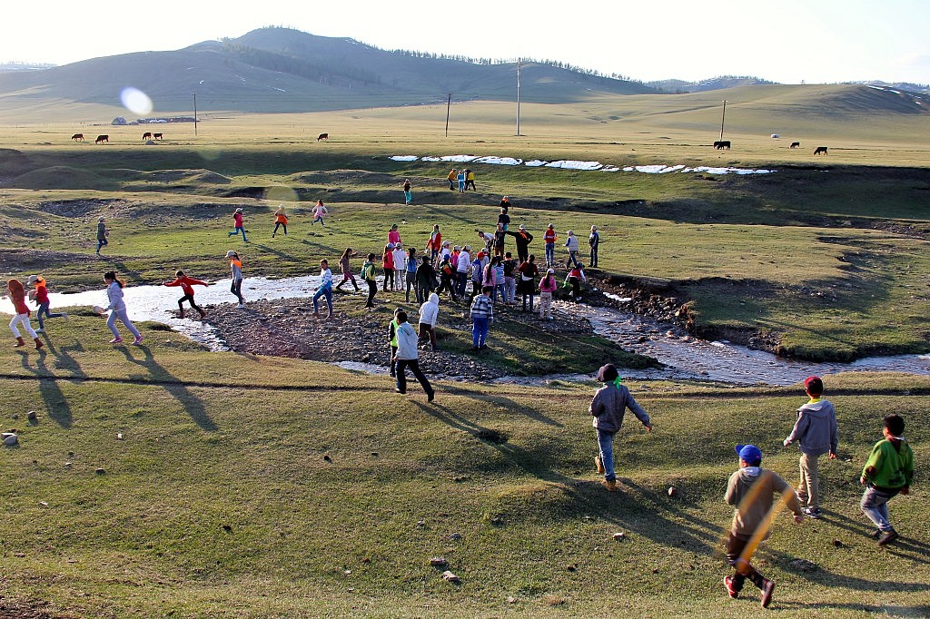 Auch die Schulleitung der Schule Nr. 14 hat sich wohl am Morgen gedacht, dass sie das super sonnige und warme Wetter ausnutzen müssen. Nachmittags kommen sie in unser Camp, um uns zu besuchen. Als Gast müssen sie natürlich etwas mitbringen. Ich hätte mich auch über Bonbons gefreut, ein ganzes Schaf hätte es nicht sein müssen. Von Gaskocher, Geschirr bis hin zu jeglichen Lebensmitteln haben sie alles dabei. Mehrere Kartons tragen sie in unsere Jurte und beginnen mit dem Kochen des Schafs. Natürlich müssen dann alle Lehrer zusammen sitzen und essen und trinken. Die Kinder können sich ruhig mal ein paar Stunden alleine beschäftigen. Okay. Das gäbe es in Deutschland im Leben nicht…Aufsichtspflicht und so, ihr wisst schon…;) Immer wieder kommt der „Koch“ aus der Jurte und bringt irgendwelche neuen gerade fertig gewordenen Schafsinnereien etc., was wir natürlich alles verzehren müssen. Ich weiß nicht, was ich alles gegessen habe. Meine Lieblingsspeisen werden Schafsinnereien aber sicherlich nicht … Natürlich fehlt auch der Wodka in der Runde nicht. Ja, das ist aber nett, wenn die Schulleitung persönlich den Wodka mitbringt, wir die Flasche leeren „müssen“ und die Kinder um uns herum spielen. Eine tolle Erfahrung, wie entspannt mongolische Lehrerinnen und Lehrer bei einer Klassenfahrt sind. Ob ich das später in Deutschland auch sein kann? Ich glaube nicht. Entweder werden binnen von Sekunden Fotos bei facebook gepostet, wie die Lehrer das Schaf essen und den Wodka trinken oder die ersten Eltern stehen auf der Matte, bzw. das Telefon steht nicht mehr still…:D