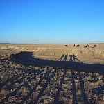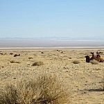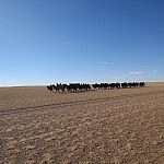 Nach einem Nickerchen erwache ich und bin erstaunt über den Wandel der Landschaften. Die Umgebung von Ulaanbaatar ist durch viele Berge und und Hügel geprägt. Plötzlich sehe ich jedoch bis zum Horizont keine einzige Erhebung an der Erdoberfläche. Bald schon erscheint die erste Kamelherde am Horizont, die gemächlich in der Sonne spaziert. Das Bild einer Wüste zeigt sich somit bereits nach wenigen Stunden.