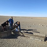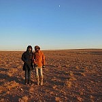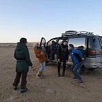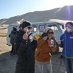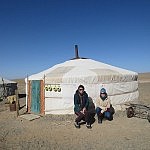 Unser Fahrer warnt uns bereits am Vorabend, dass es morgen wohl eine anstrengend Fahrt geben wird. Das hält uns dennoch nicht davon ab das ein oder andere Bier in der Jurte gemütlich mit einem Nachbarstourist zu trinken. Wir starten sehr früh. Die Fahrt verläuft sehr gut. Nach einer Weile müssen wir dringend tanken. Eigentlich auch kein Problem, jedoch erreichen wir dann ein Sum(kleines Dorf), in welchem es zwar eine Zapfsäule aber keinen Diesel gibt. Hmm. Weiter geht es zum nächsten Sum. Dieses liegt glücklicherweise nicht so weit entfernt. Hier gibt es auch eine Zapfsäule, sogar diesmal Diesel, aber keinen Tankwart. Wir warten ca. 1,5 Std. auf einen Menschen, der uns beim Tanken behilflich ist. Wie nett, dass die Menschen hier alle mit einer enormen Ruhe ausgestattet sind. Sollte ich mir wohl mal eine Scheibe von abschneiden. Weiter geht nun unsere Fahrt. Wir haben leider viel Zeit verloren. Es liegt noch ein recht langer Weg vor uns. Die Pisten werden zudem immer schlechter. Oh nein! Jetzt auch noch das! „Was ist los?“, fragen wir uns! Unser Fahrer wird plötzlich von einem Jagdfieber gepackt und heizt hinter einem Fuchs her. Vergebens. Wir erwischen ihn leider nicht. Als das Auto zum Stehen kommt fragen wir, was das denn sollte? Naja, wenn man einem Fuchs während der Fahrt begegnet, dann muss man ihn umbringen. Andernfalls bringe dies Unglück! War es wohl der Fuchs, oder doch der nichteintreffende Tankwart, oder doch einfach nur Zufall? Denn es wird bereits dunkel und den Weg, welchen wir wählen, wird durch einen zugefrorenen Fluss durchkreuzt. Unser Fahrer beschließt nicht durch diesen Fluss zu fahren. Wir drehen um und fahren nun durch hohe Grasfelder. Fast wie im Film auf der Jagd nach…hmm vielleicht einem Fuchs? Jedenfalls erreichen wir nach einer Weile erneut ein eingefrorenes Flussbett. Diesmal fahren wir rein. War das so eine gute Idee? Wir liegen ziemlich schief im zerbrochenen Eis und kommen nur schwer wieder aus diesem heraus. Wir alle fürchten das Umkippen und kneifen die Augen zu. Sarahs Gedanke: „Was um Himmelswillen machen wir hier? Wir sind doch kein Boot!“