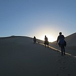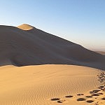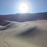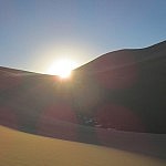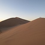 Der Anblick, sobald man über den Kamm der Düne hinwegschauen kann, ist phänomenal! Er macht jegliches Erschöpfungsgefühl wet. Die Sonne scheint uns ins Gesicht, die Sandlandschaft wird angestrahlt und schimmert in einem satten gold/gelb. WOW! Bisher das Beeindruckenste was ich sehen durfte. Nicht nur der Anblick, sondern die Kombination aus Weite, faszinierenden Anblicken und Ruhe macht den Aufstieg auf die Düne zu einem unvergessenen Erlebnis.