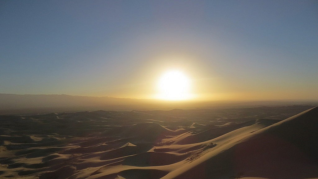 Der Anblick, sobald man über den Kamm der Düne hinwegschauen kann, ist phänomenal! Er macht jegliches Erschöpfungsgefühl wet. Die Sonne scheint uns ins Gesicht, die Sandlandschaft wird angestrahlt und schimmert in einem satten gold/gelb. WOW! Bisher das Beeindruckenste was ich sehen durfte. Nicht nur der Anblick, sondern die Kombination aus Weite, faszinierenden Anblicken und Ruhe macht den Aufstieg auf die Düne zu einem unvergessenen Erlebnis.