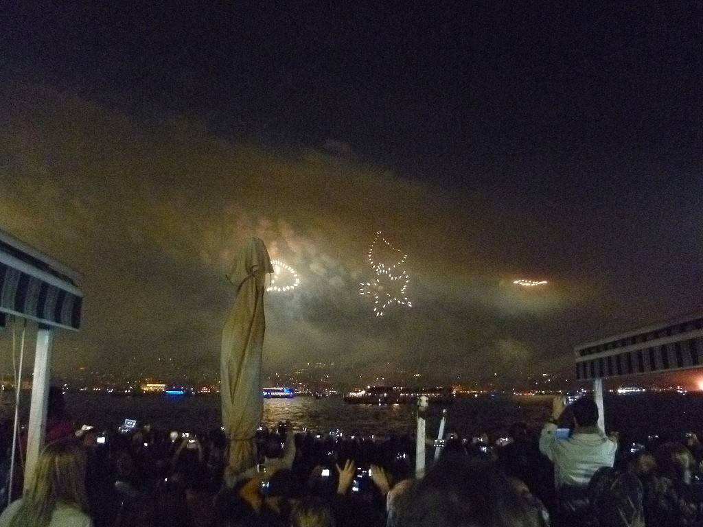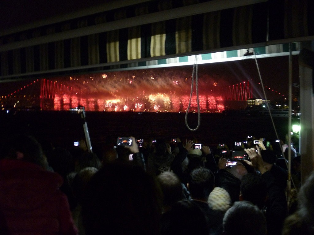 Das restliche Feuerwerk ging dann von kleinen Booten aus, die auf dem Bosporus verteilt waren. Es war einfach toll mit anzusehen und als dann auch noch Sterne und Halbmonde (also die Symbole der türkischen Flagge) in die Luft geschossen wurden, gab es kein Halten mehr und die Menge brach in Jubel aus.