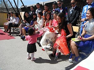 Nach dem Programm folgte das obligatorische Fotoshooting der Schulabgänger auf dem roten Tepich. Außerdem bekamen die Eltern der Abschlussschüler eine Schale Milch auf einem blauen Tuch überreicht. Dies soll wohl ein Zeichen der Dankbarkeit der Kinder den Eltern gegenüber symboliseren. Danach bedankten sich die Schüler auch noch mit kleinen Geschenken bei ihren Lehrern und zogen unter Glockenklang (die Einschulung wird auch Glockenfest genannt) ein letztes Mal in das Schulgebäude ein.