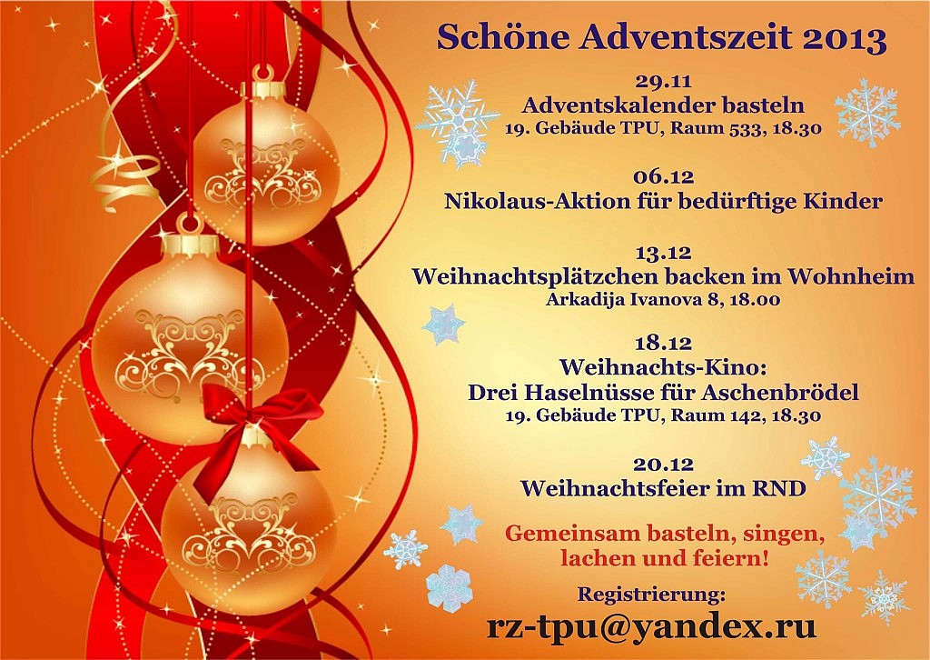 Freitag kam unserer großer Abschluss mit der DAAD-Alumni-Veranstaltung „Mach was!“. Dana sagte was zum Thema „Freiwilligen Engagement bei Bewerbungen“ und ich hielt einen Vortrag über „Freiwilligendienste in und nach Deutschland“. Das kam sehr gut an. Viele Studenten und Dozenten wussten nicht, dass man so für ein Jahr nach Deutschland gehen kann, um seine Sprachkenntnisse zu verbessern und sozial aktiv zu werden. Ich fand die Veranstaltung sehr gelungen, auch wenn viele die angemeldet waren, doch noch in letzter Minute absagten. Selbst Schuld! Ich finde es wirklich sehr schade, dass das Interesse und die eigene Aktivität der Studenten und vor allem Dozenten hier an der TPU oder generell in Tomsk so gering sind. Ich meine da versucht man ein aktuelles Deutschlandbild zu vermitteln, macht etwas zu interessanten Themen auch für Studierende hier und bemüht sich interaktiv etwas mit den deutschen Traditionen zu machen und es kommt fast keiner. Freitag war das anders, es waren schon ca. 50 Leute da, dazu gehörten aber auch viele, die wir zum interaktiven „Markt der Möglichkeiten“ eingeladen hatten. Und hätten wir am Dienstag nicht so viel Panik im Lehrstuhl verbreitet, wären bestimmt auch nicht so viele Studenten (ca. 20) von und mit ihren Dozentinnen(ca. 3 von 15) da gewesen. Egal, nicht aufregen… das bringt auch nichts!