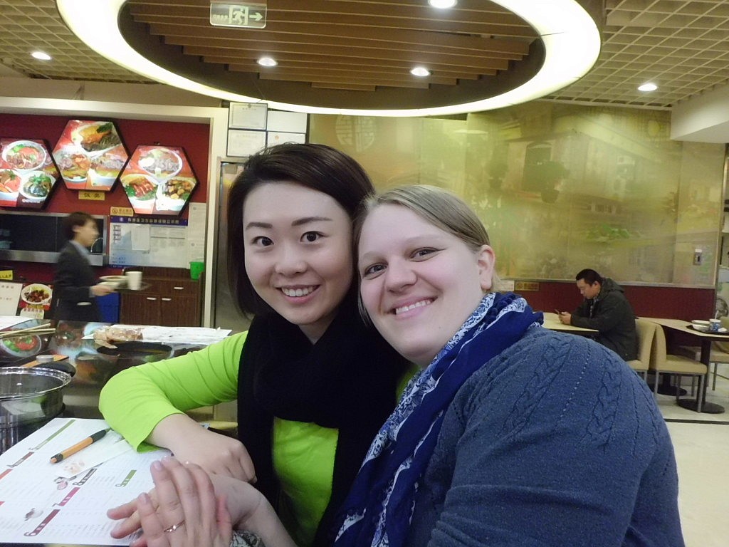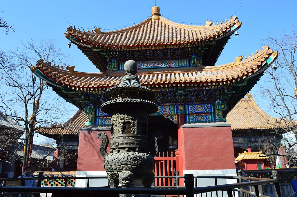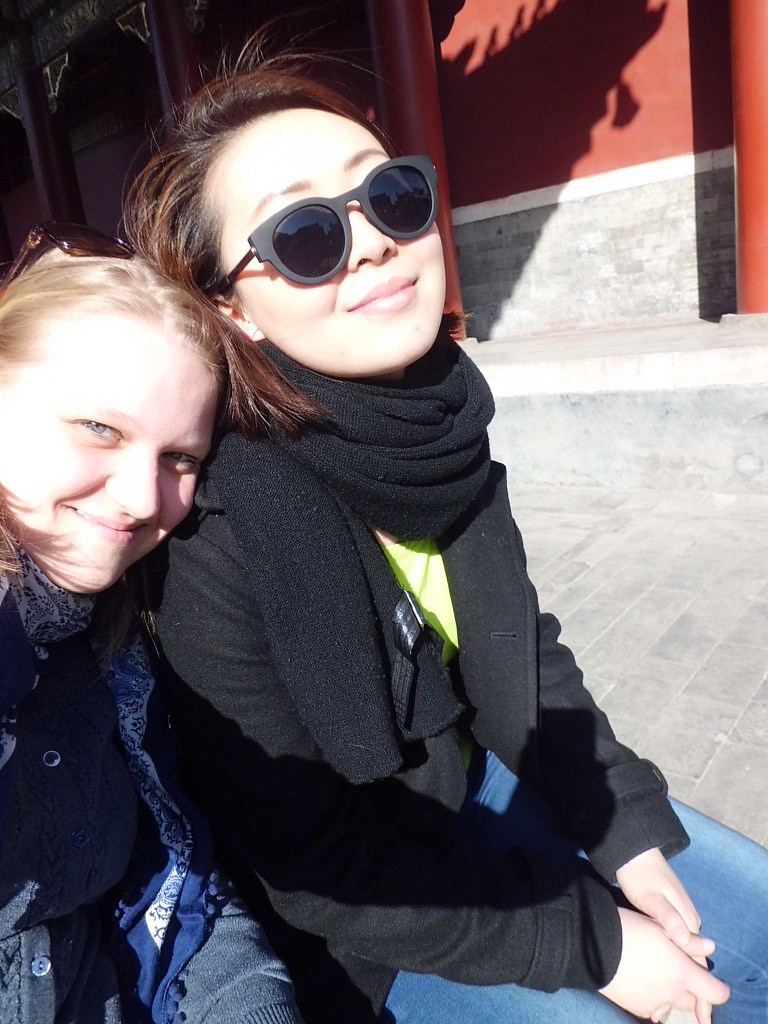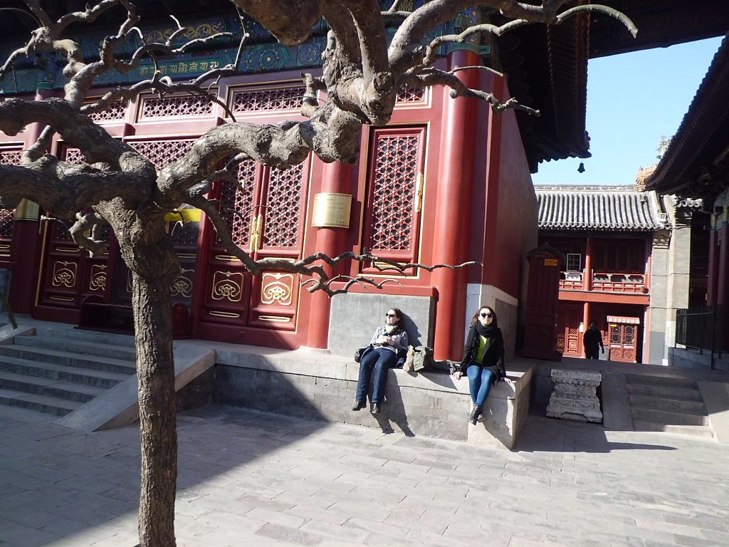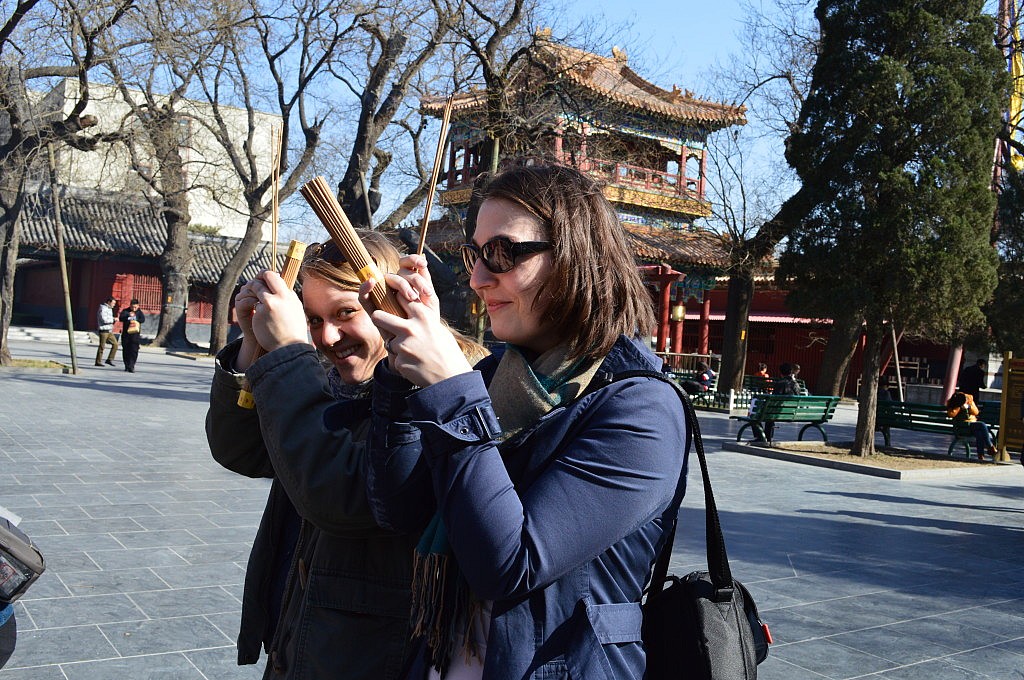 Um 12 Uhr sollten wir uns mit Jing an der Hausnummer 88 treffen. Romy und ich irrten von einem Haus zum nächsten und liefen gefühlte 500 Mal ein kleines Stück Wufangjing ab, ohne Erfolg. Irgendwann begann ich Menschen zu fragen, erst in einem Apple-Store, der junge Mann sagte und, dass es gleich gegenüber das Haus sei. Romy glaubte ihm aber nicht und so fragten wir auch noch in einem Hotel und eine nette Dame auf der Straße… als ich dann doch noch den Hausmeister des Edelkaufhauses fragte, meinte der mit nicken und lächeln „Ja ja, hier!“ Hmmm, super das Haus hatte 3 Eingänge und wir waren auch echt fertig. Also beschlossen wir am „Haupteingang“ zu warten und die Sonne zu genießen. Hatte ich schon gesagt, dass das Wetter phantastisch war? Neben einer großen katholischen Kirche, die Jing als Treffpunkt nicht eindeutig genug fand 😛 Nach einer viertel Stunde fing ich an Menschen auf Englisch anzusprechen, ob ich mal telefonieren dürfte, da ich keine chinesische Handynummer hatte. Mein dritter Versuch klappte und so stellte sich heraus, dass Jing einfach nur auf der anderen Hausseite stand. Das war eine Freude! Nach zwei Jahren sahen wir und endlich wieder und dann auch noch wirklich in China. Damals hatte ich mehr aus Spaß gemeint, dass ich sie mal besuchen komme, doch jetzt arbeitet sie beim DAAD in Peking und der Zufall wollte es, dass sie genau einen Monat früher bei facebook postete, dass sie eine neue Arbeit gefunden hatte. Wir gingen gleich alle drei Mittagessen und zwar „Hotpot“ essen. Jeder von uns bekam einen eigenen Topf und Jing bestellte gefühlt die halbe Karte. Es gab Tofu, Pilze, Grünzeug, Fleisch, Shrimps, und und und, das man zum Garen in den Topf warf und nach einer kurzen Zeit mit seinen Stäbchen wieder rausfischen musste. Es war wirklich lecker und hatte den gleichen Effekt wie Fondue. Man saß eine lange Zeit zusammen, hatte das Gefühl die ganze Zeit zu essen, aber wurde nicht wirklich satt… es war einfach toll und es gab viel zu erzählen. Im Anschluss daran zeigte uns Jing, die bis zum Abend frei hatte, den Lamatempel. Das Wetter war einfach genial und der Tempel wirklich beeindruckend. Man ging immer durch das Innere des Tempels hindurch und kam in einen neuen Hof und zu einer weiteren Möglichkeit Räucherstäbchen anzuzünden und zu beten. Nach dem Tempel gingen wir zu Fuß in eine kleine aber sehr schöne Einkaufsstraße mit vielen süßen Geschäften und gönnten uns in einem Cafe eine Pause. Ich kann jetzt perfekt auf Chinesisch Pu Er Chai bestellen, der aber leider nach nix schmeckt. Auf dem Weg zu unserem letzten gemeinsamen Besichtigungspunkt unserer Tagestour, einem großen See, lud mich Jing noch ein „Stinketofu“ zu essen. Der riecht echt grausam und schmeckt meiner Meinung nach nix. Aber man weiß echt schon 2 km bevor ein Stand kommt, dass man dort diesen Tofu in einer komischen Soße verkauft. Und es soll eine Delikatesse sein… jaja.