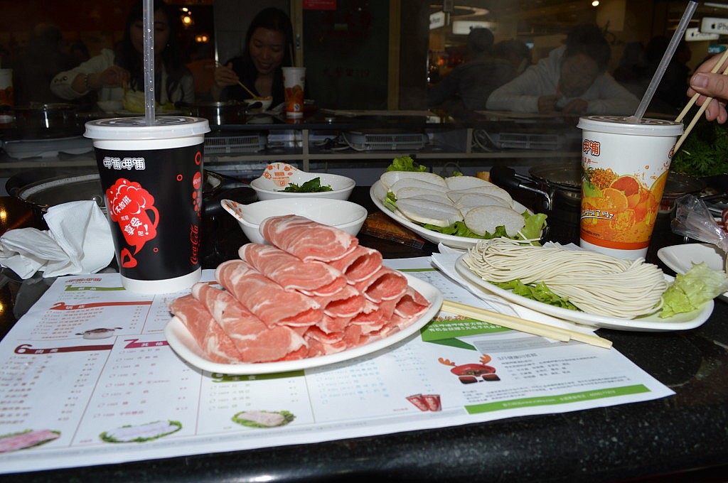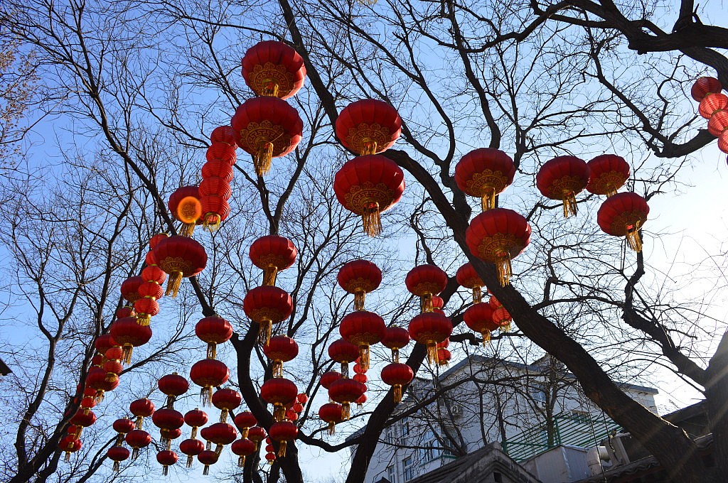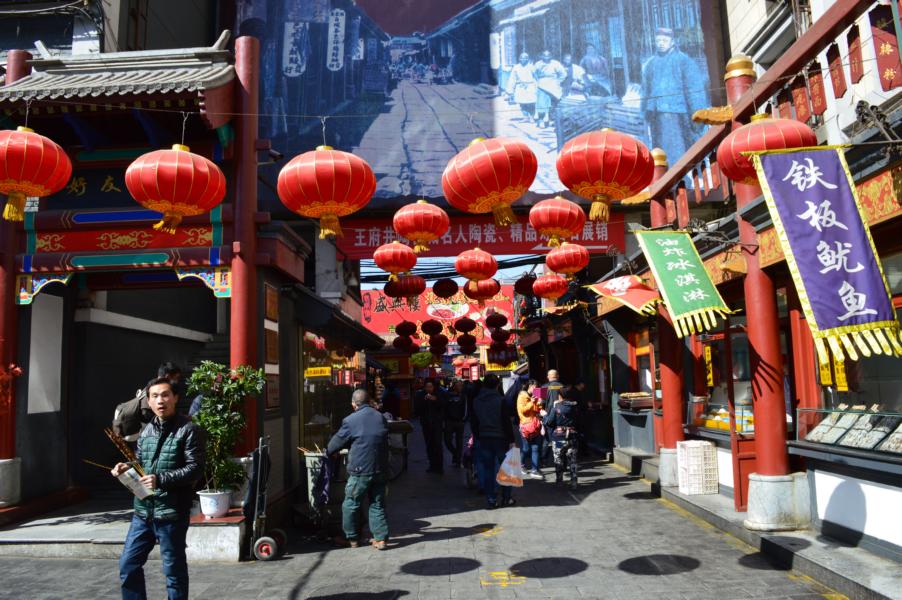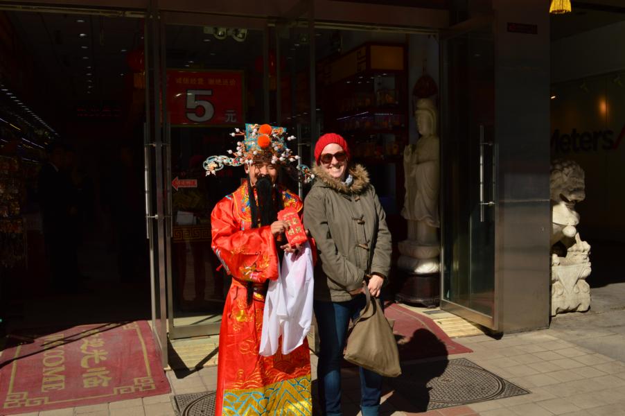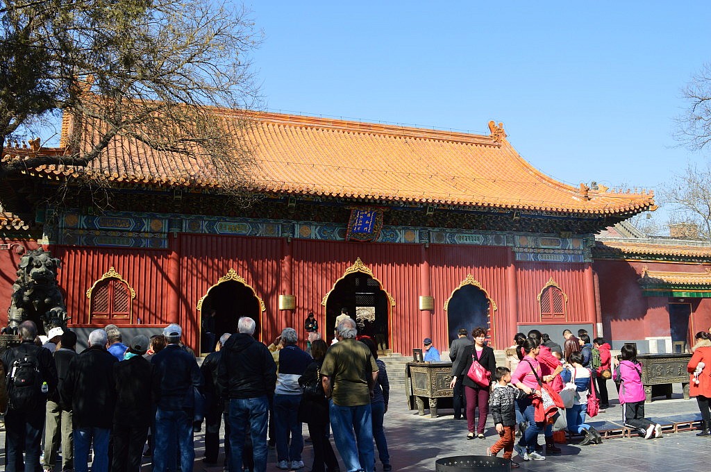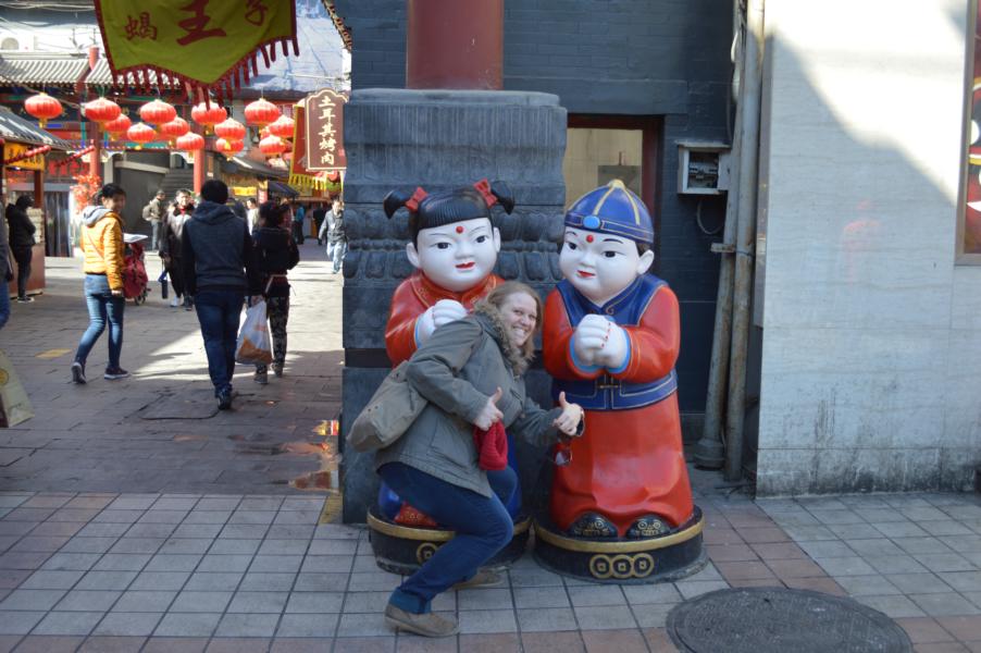 Um 12 Uhr sollten wir uns mit Jing an der Hausnummer 88 treffen. Romy und ich irrten von einem Haus zum nächsten und liefen gefühlte 500 Mal ein kleines Stück Wufangjing ab, ohne Erfolg. Irgendwann begann ich Menschen zu fragen, erst in einem Apple-Store, der junge Mann sagte und, dass es gleich gegenüber das Haus sei. Romy glaubte ihm aber nicht und so fragten wir auch noch in einem Hotel und eine nette Dame auf der Straße… als ich dann doch noch den Hausmeister des Edelkaufhauses fragte, meinte der mit nicken und lächeln „Ja ja, hier!“ Hmmm, super das Haus hatte 3 Eingänge und wir waren auch echt fertig. Also beschlossen wir am „Haupteingang“ zu warten und die Sonne zu genießen. Hatte ich schon gesagt, dass das Wetter phantastisch war? Neben einer großen katholischen Kirche, die Jing als Treffpunkt nicht eindeutig genug fand 😛 Nach einer viertel Stunde fing ich an Menschen auf Englisch anzusprechen, ob ich mal telefonieren dürfte, da ich keine chinesische Handynummer hatte. Mein dritter Versuch klappte und so stellte sich heraus, dass Jing einfach nur auf der anderen Hausseite stand. Das war eine Freude! Nach zwei Jahren sahen wir und endlich wieder und dann auch noch wirklich in China. Damals hatte ich mehr aus Spaß gemeint, dass ich sie mal besuchen komme, doch jetzt arbeitet sie beim DAAD in Peking und der Zufall wollte es, dass sie genau einen Monat früher bei facebook postete, dass sie eine neue Arbeit gefunden hatte. Wir gingen gleich alle drei Mittagessen und zwar „Hotpot“ essen. Jeder von uns bekam einen eigenen Topf und Jing bestellte gefühlt die halbe Karte. Es gab Tofu, Pilze, Grünzeug, Fleisch, Shrimps, und und und, das man zum Garen in den Topf warf und nach einer kurzen Zeit mit seinen Stäbchen wieder rausfischen musste. Es war wirklich lecker und hatte den gleichen Effekt wie Fondue. Man saß eine lange Zeit zusammen, hatte das Gefühl die ganze Zeit zu essen, aber wurde nicht wirklich satt… es war einfach toll und es gab viel zu erzählen. Im Anschluss daran zeigte uns Jing, die bis zum Abend frei hatte, den Lamatempel. Das Wetter war einfach genial und der Tempel wirklich beeindruckend. Man ging immer durch das Innere des Tempels hindurch und kam in einen neuen Hof und zu einer weiteren Möglichkeit Räucherstäbchen anzuzünden und zu beten. Nach dem Tempel gingen wir zu Fuß in eine kleine aber sehr schöne Einkaufsstraße mit vielen süßen Geschäften und gönnten uns in einem Cafe eine Pause. Ich kann jetzt perfekt auf Chinesisch Pu Er Chai bestellen, der aber leider nach nix schmeckt. Auf dem Weg zu unserem letzten gemeinsamen Besichtigungspunkt unserer Tagestour, einem großen See, lud mich Jing noch ein „Stinketofu“ zu essen. Der riecht echt grausam und schmeckt meiner Meinung nach nix. Aber man weiß echt schon 2 km bevor ein Stand kommt, dass man dort diesen Tofu in einer komischen Soße verkauft. Und es soll eine Delikatesse sein… jaja.