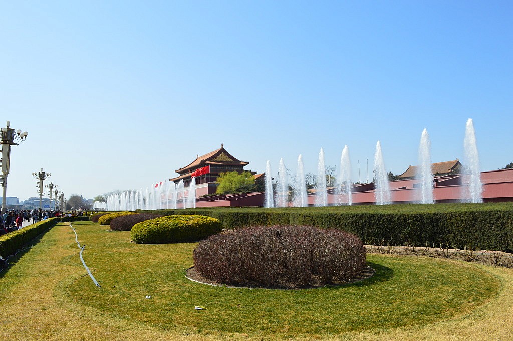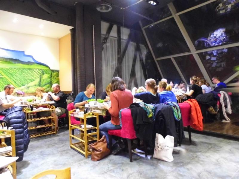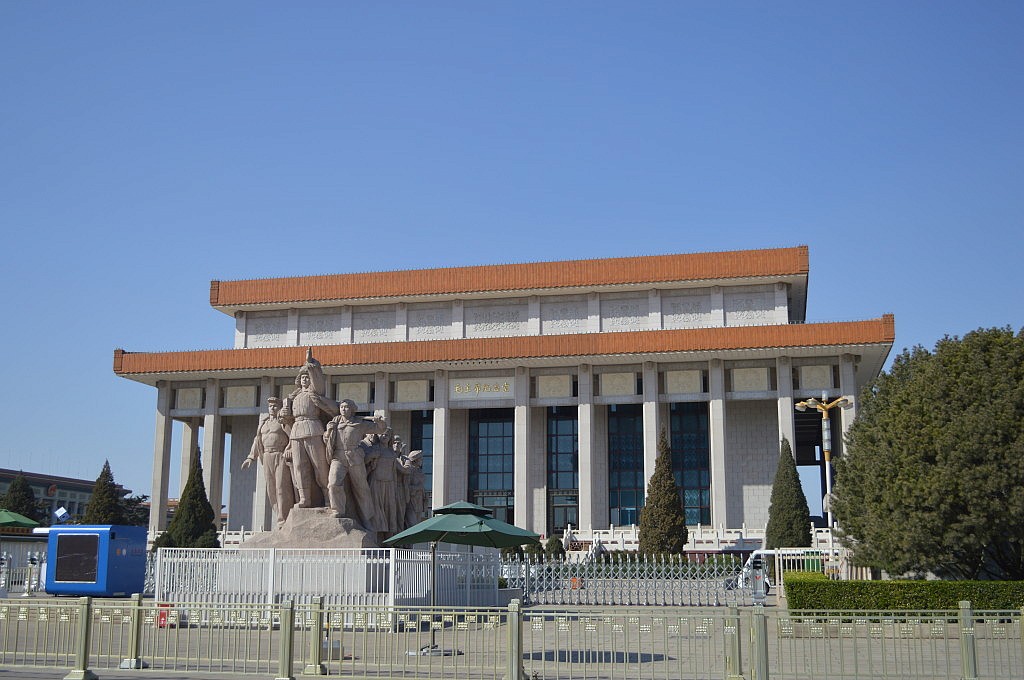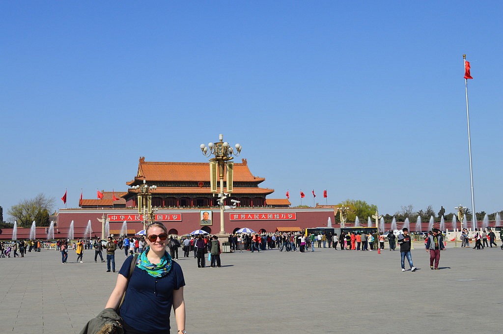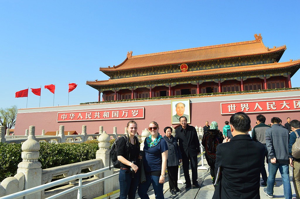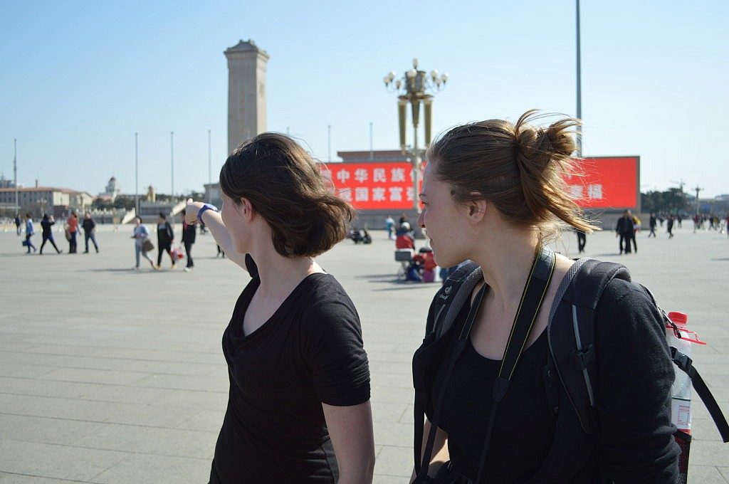 Anschließend besuchten wir den Platz des himmlischen Friedens, aber nicht ohne ein Bild mit Mao natürlich. Auf dem Platz selbst wurden wir wieder zur Attraktion und durften nicht nur mit Chinesen gemeinsam Fotos machen, sondern wurden auch einfach so zu Hauf mit dem Handy fotografiert. Inzwischen war es schon mittags zum 3 und wir beschlossen zum Ausruhen in unsere Hostels zu gehen und uns abends zum gemeinsamen Abendessen mit Michi zu treffen. Als wir um 19 Uhr an besagter Metrostation ankamen, war ich total fasziniert von der Tanzgruppe, die da in völliger Ruhe öffentlich tanzte. Vor lauter Begeisterung und Faszination merkte ich gar nicht, wie ich in Mara, Goschja und Fabian rannte. Im Endeffekt saß ein großer Tisch Boschis zusammen und gönnte sich Unmengen an Spießchen. Es war toll mal wieder, nach Georgien, so viele bekannte Gesichter zu sehen und alle waren noch total aufgekratzt in China zu sein. Nach dem Essen verabschiedete sich Romy und ich brav, um ins Hostel zu fahren, zu packen und früh schlafen zu gehen, während die Anderen noch mindestens eine Bar unsicher machten. Als wir gerade in unseren Bettchen lagen, klopfte es an der Tür und Flavia lächelte uns entgegen. Sie war abends angekommen und hatte in der Bar gerade ein zwei Bierchen getrunken. Wir verabredeten und für den nächsten Morgen und gingen alle pennen.
