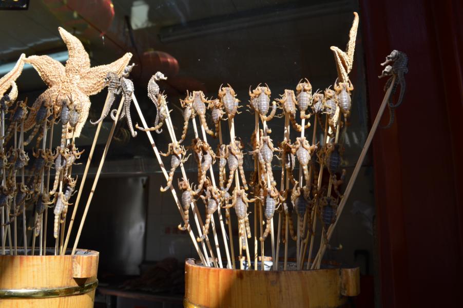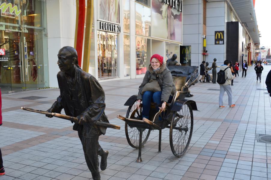 Im Flugzeug konnte ich 4 Stunden tief und fest schlafen vor Erschöpfung und wachte wirklich nur kurz zum Essen auf, um dann sofort wieder weiter zu schlafen. So kam ich zwar ein wenig gerädert, aber doch eigentlich fit morgens um 5 in Peking an, konnte gleich den ersten Zug um 6 Uhr zum Bahnhof nehmen und sah einen genialen Sonnenaufgang als Willkommensgeschenk. Da mir Jing, eine Freundin aus Jena mit der ich als International Scout im Haus auf der Mauer gearbeitet hatte, eine sehr gute Beschreibung zu meinem Hostel geschickt hatte, kam ich relativ flott und ohne großen Stress um 7 Uhr an und fand eine sehr überraschte Romy im Handtuch vor. Es wurde nicht lange gefackelt, sondern gleich zügig zum Frühstück gegangen. Es war schon strange irgendwo in China, vor allem in Peking zu sein und gemeinsam mit Romy beim Frühstück zu sitzen. An diesem ersten Tag sagte ich wohl auch alle 10 Minuten „Peking! Ich bin in Peking! Unglaublich!“ Draußen fotografierte ich alle Fahrräder, vor allem die Mütter und Väter, die ihre Einzelkinder auf dem Gepäckträger zur Schule fuhren. Romy zeigte mir gleich die große Einkaufsstraße (Kaptalistenstraße, wie sie zu sagen liebt) und so schlenderten wir stundenlang durch Läden und auch eine ziemlich eklige, aber mir wohl ewig im Gedächtnis bleibende Marktstraße. Dort gab es nicht nur Heuschrecken und Seepferdchen auf Spießen, sondern auch noch kleine Miniskorpione, die noch an ihren Spießen zappelten… aber am schlimmsten war eigentlich der Geruch. Zwischen den ganzen kleinen Ständen standen große offene Mülltonnen, die nicht gerade gut rochen und zwischendrin hungrige Chinesen, die sich irgendwelche undefinierbare Dinge in die Münder stopften und „Stinke Tofu“. Zu diesem Zeitpunkt war mir das noch kein Begriff, aber der Gestank war erbärmlich. Mir wurde ziemlich schlecht und ich musste auf direktem Weg aus dieser Delikatessengasse raus.