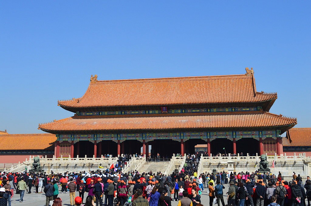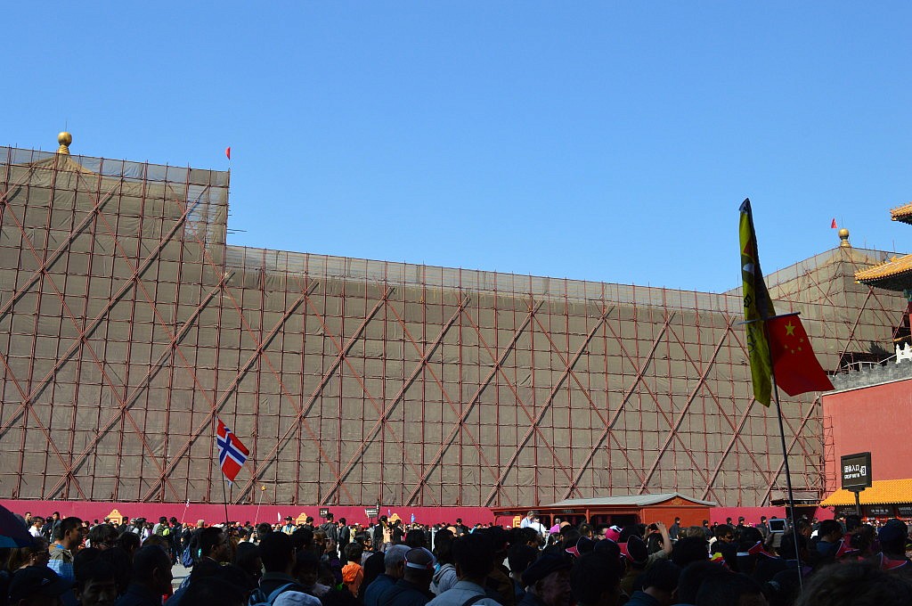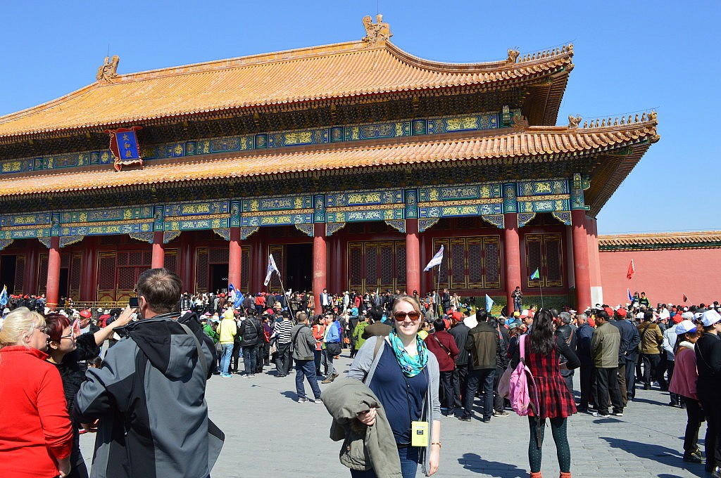 Und so begaben wir uns in die unendlichen Massen von Chinesen und Ausländern, die an diesem Tag in die Verbotene Stadt pilgerten, da am Tag zuvor Michele Obama zu Besuch war und die Stadt für die Öffentlichkeit gesperrt war. Aber manchmal ist es eben doch ein Vorteil Ausländer und in kleinen Gruppen unterwegs zu sein, denn wir kamen relativ schnell voran. Allerdings hatte Romys Marco Polo Reiseführer recht, denn wenn man nicht sehr früh vor all den anderen in die Verbotene Stadt kommt, ähnelt das Besichtigen der Thronräume und des Innenlebens der Tempel einem Schlachtfeld. Es wird geschupst, geschrien, fotografiert und gedrängelt al ob es kein Morgen gibt. Nach dem zweiten Versuch gab ich auf und genoss einfach das Wetter, die Atmosphäre und das Gefühl in einem chinesischen Film zu sein J Die Gebäude sehen wirklich alle aus wie in den Filmen von Tiger und Dragon und unwillkürlich musste ich die ganze Zeit an Mulan denken. Wir hatten uns die Audioguides ausgeliehen und ließen uns von chinesischen Sprechern Informationen und Anekdoten aus der Kaiserzeit erzählen. Spannend waren für uns vor allem die Geschichten der Konkubinen und wie man an Ansehen gelangte. Die Aussprache und Betonungsfehler der Sprecher ließ uns abwechselnd schmunzeln und kichern, so klang beispielsweise Charisma wie eine Krankheit und fasziniert waren wir auch, dass eine Konkubine nach einer Ohrfeige vor Gram und Ärger starb.