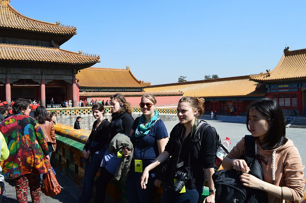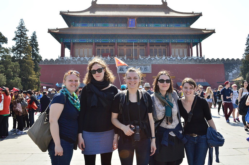 Bereits beim Ausflug zur Mauer wurden Franzi, Ellli und Marei von einer chinesischen Studentin von Michi begleitet. Wir hatten ausgemacht, dass wir uns um 9 Uhr an der Metrohaltestelle am Platz des himmlischen Friedens treffen wollten, doch leider gab es zwei verschiedene Haltestellen und wir hofften einfach nur, dass wir an der richtigen ausgestiegen waren. Glücklicherweise stand das Mädchen gleich da und freute sich, dass wir so pünktlich angekommen waren. Jetzt hieß es nur noch auf die anderen warten. Doch nach 20 Minuten waren sie immer noch nicht da… natürlich hatten wir keine Handynummer und Romy wurde langsam pissig. Wir wurden die ganze Zeit angestarrt, man konnte genau sehen wer wohl vom Land kommt und das erste Mal in Peking ist und das erste Mal „Langnasen“ und „Bleichgesichter“ sieht 😉 Romy wollte schon ein Schild aufstellen „Nicht berühren! Nicht füttern!“ Es stellte sich heraus, dass die Mädels an einer Metrostation in der Nähe ausgestiegen waren, dann zu unserer Station liefen und draußen warteten, während wir drinnen unten darauf warteten, dass sie aus der Bahn kommen. Nun ja, nach nur schlappen 45 Minuten fanden wir uns dann auch tatsächlich!