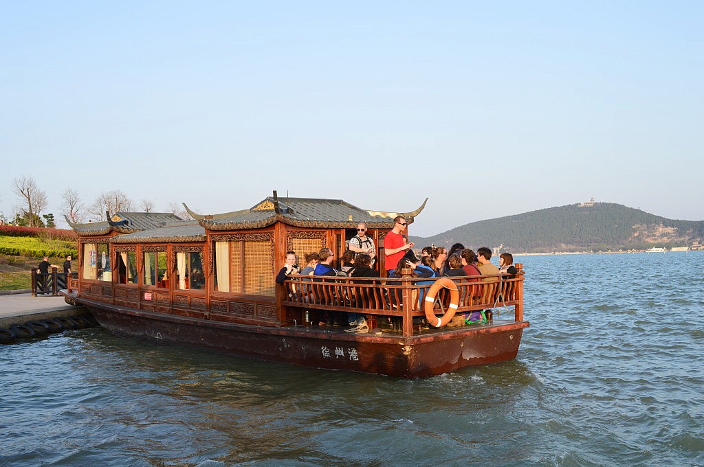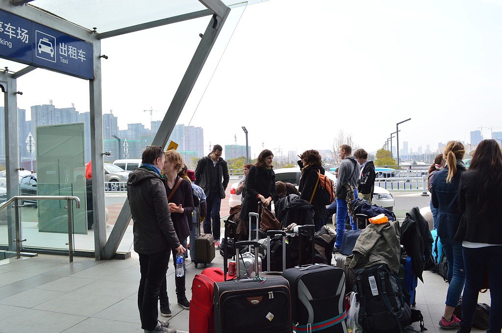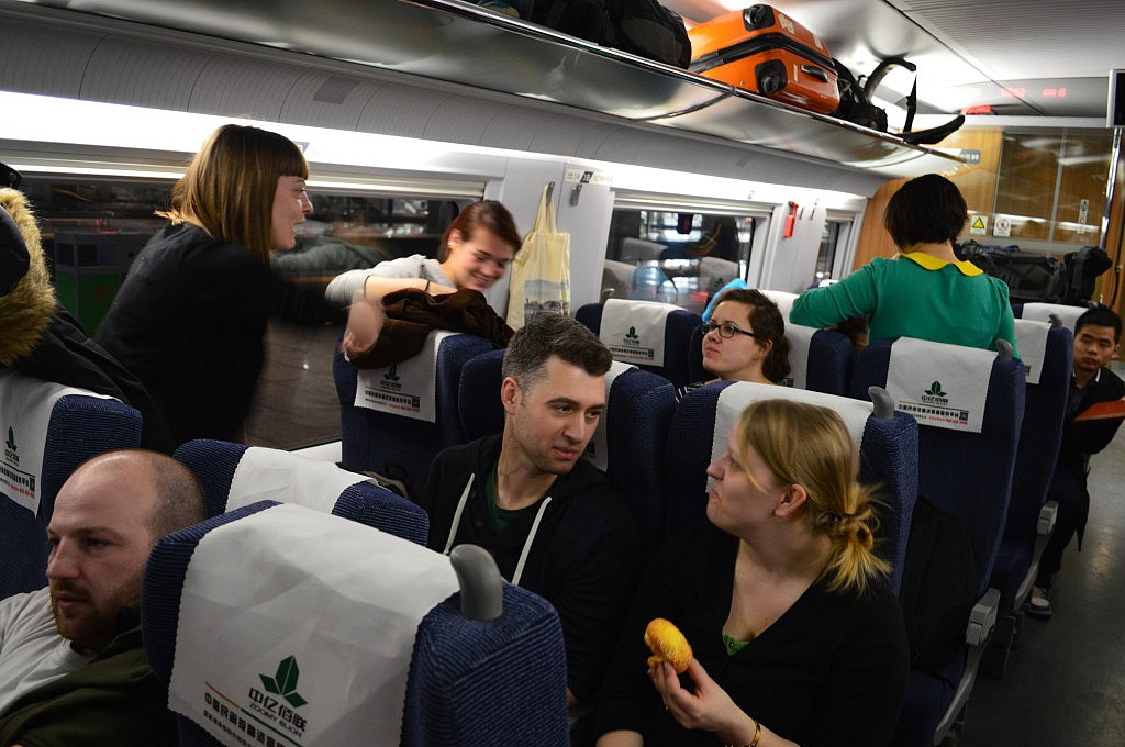 Morgens mussten wir um 8 Uhr am Bahnhof stehen, der eine gute halbe Stunde und mit zwei Mal umsteigen von uns entfernt war. Ich hatte mit meinem Trackingrucksack glück, denn meist gibt es in Peking nur Rolltreppen, die Menschenmassen von unten nach oben befördern und so mussten Romy und Flavia ihre schweren Koffer meist die Treppen runterwuchten. Als wir am Bahnhof ankamen war das Wiedersehen eine noch größere Freude, da noch viele weitere Gesichter nicht nur von Lektoren zu entdecken waren, sondern auch von unseren „Chefs“ des Programms. Gemeinsam stiegen wir in den komfortablen Hochgeschwindigkeitszug ein, der mit 306 km/h nach Xuzhou bretterte. Die vier Stunden vergingen im Flug, ich kam nicht zum Schlafen, sondern quatschte oder schrieb an meiner Skizze für das Innovationsstipendium.