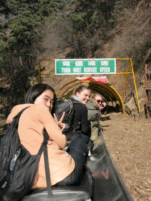 Die Mauer war auch genial! Das Wetter war… na wie wohl… phänomenal. Romy und ich fuhren mit der Gondel nach oben und liefen gemeinsam 3 Stunden treppauf treppab, während die anderen die Treppen nach oben nahmen und dann relaxt auf den Stufen saßen und Bier tranken, als wir zu unserem Treffpunkt zurückkamen. Zum Abschluss fuhren wir alle gemeinsam die 1585 Meter lange Sommerrodelbahn nach unten… leider hatten wir eine chinesische Schnecke vor uns, aber Spaß hats trotzdem gemacht. Danach gings zum Mittagessen in ein Restaurant und dann ab in den Bus zu unserem 2-stündigen Heimfahrt-Mittagsschläfchen. Um 4 Uhr kamen wir wieder am Hostel an und gingen auf die Suche nach einem Cafe. Das war nicht das einfachste Unterfangen, aber wir schafften es doch. Danach gingen Romy und ich in unser Hostel und eigentlich war uns schon klar, dass wir zu müde und lustlos waren das Bett noch einmal zu verlassen. Die anderen meldeten sich eh nicht, da sie auf dem Weg zum Hostel Jane trafen und sich gleich noch mit Michi, dem Lektor in Peking trafen und versackten. Und an Tag 3 sollte die Verbote Stadt plus der Platz des himmlischen Friedens folgen.