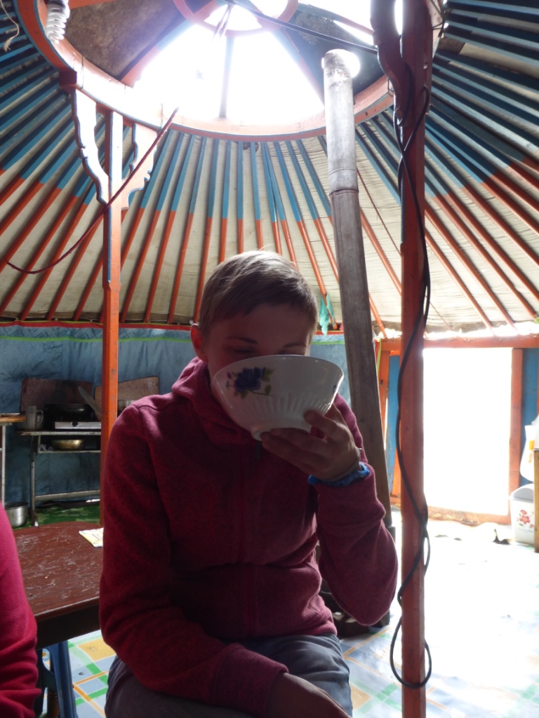On our way back we stopped to try Airag, fermented mare milk, which is a delicatesse here. It has a little alcohol in it and has a light taste as wine. Very yummy!