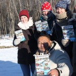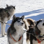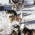 We had to separate the group into two parts as we were too many people. Off to the sporty part number two: I formed a group with Kirsten. She took the steering part first and after approximately half way we changed.She had the part on the frozen river, slippery but more or less straight. It is strange to sit in front without having control over the whole thing, the dogs run as cuckoo and you can just stop by taking the break, steering the sleight with the own body weight and when stopping completely we had to take out a extra break, otherwise no chance to stop the dogs. I got the part were I had to hop off several times, hop back on the sleigh again, pushing the sleigh several times and controlling the snarling dogs as a cow passed by. I do not really know whether it is more cruelty to animals or whether the dogs really like it. One the one hand it seemed as the dogs like to give everything, then they bared their teeth to the other dogs in front of other sleighs and seemed very aggressive and finally I guess they were not kept and transported very good as most of them had a lot of bite traces…