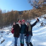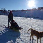 We had to separate the group into two parts as we were too many people. Off to the sporty part number two: I formed a group with Kirsten. She took the steering part first and after approximately half way we changed.She had the part on the frozen river, slippery but more or less straight. It is strange to sit in front without having control over the whole thing, the dogs run as cuckoo and you can just stop by taking the break, steering the sleight with the own body weight and when stopping completely we had to take out a extra break, otherwise no chance to stop the dogs. I got the part were I had to hop off several times, hop back on the sleigh again, pushing the sleigh several times and controlling the snarling dogs as a cow passed by. I do not really know whether it is more cruelty to animals or whether the dogs really like it. One the one hand it seemed as the dogs like to give everything, then they bared their teeth to the other dogs in front of other sleighs and seemed very aggressive and finally I guess they were not kept and transported very good as most of them had a lot of bite traces…
