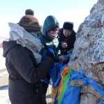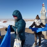 At the monastery we had the chance to attend a special ceremony which is held once a day. This ceremony should fill us with energy. Yeah great start! Then we went to the place where we would liked to immolate rice, vodka, milk, aruul (dried curd – a Mongolian treat) and blue scarfs. Furthermore we would like to burn a bad experience and make a wish for the future. Due to the coldness the lighter was not working… Unfortunately we could not burn our bad experiences 🙁 Instead of burning our wishes we lay on the ground and absorbed as much energy as possible and it was not even too cold on the ground.