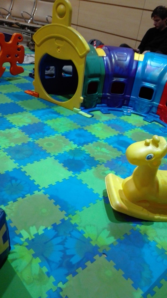 Wir kommen nicht an unser Gepäck. Da das Gepäck auf Moskau gebucht ist, müssen wir zur Gepäckausgabe. Was sich ohne Visa als de-facto unmöglich erweist. Also hoch zum Transit-Check-in. Es ist inzwischen Mitternacht und zwei übermüdete aber heldenhaft eifrige Beamtinnen erklären uns, das wir n bissel blöde waren, und das wir warten sollen. Eine Stunde später haben wir die Zusicherung, dass unsere Taschen nach Tokio mitkommen. Außerdem gibts noch ne Runde Bordkarten für den Moskau – Tokio Flug und endlich ab in den Transitbereich. dort die nächste Herausforderung. Unser Flug geht erst in ~16 Stunden. Ab ins Kinderparadies. Der relativ kleine Raum ist mit Großplastikspielzeug ausgestattet, so Kindertische und so.. Außerdem läuft gruselige Weihnachtsmusik oder es kommen Knallgeräusche, weil auf dem Beamer, der einen Teil des Bodens beleuchtet, Schneeflocken auf dem „Boden“ fallen. Und dabei halt Knallgeräusche machen. Laute Knallgeräusche. Schwer zu verstehen? Für uns auch.