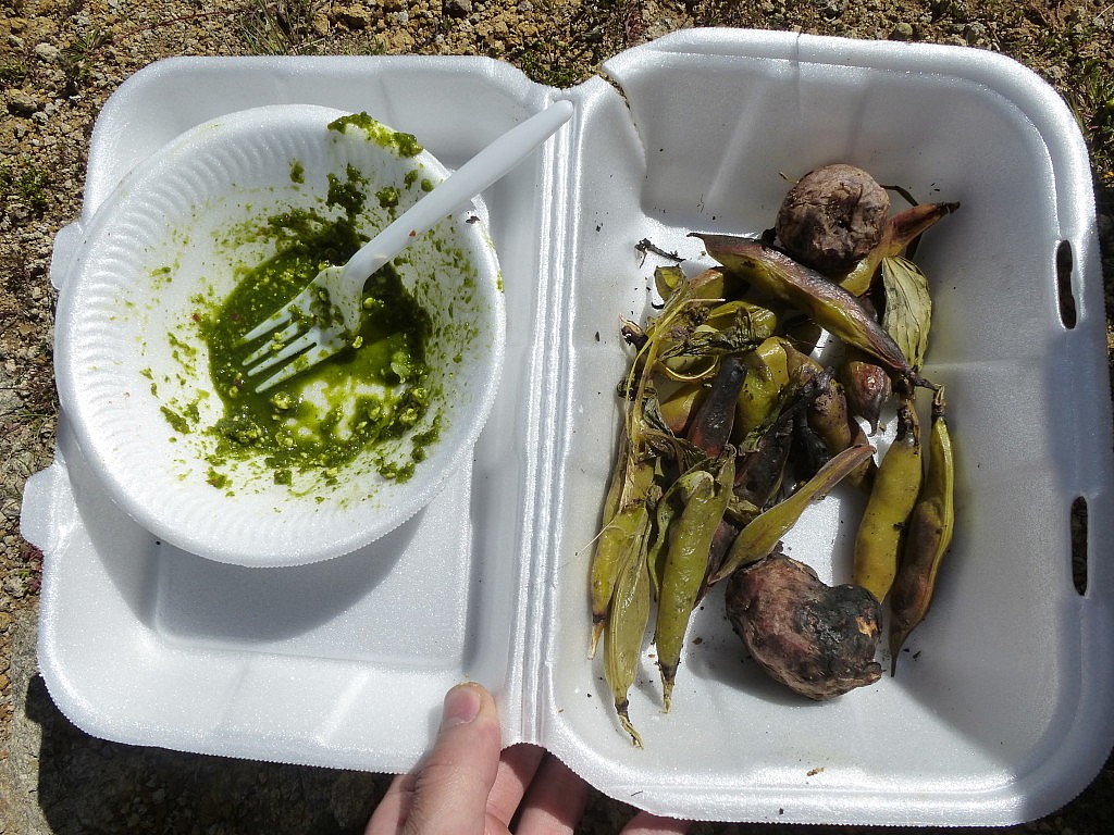 P1040284 26. Mai 2015 1024 × 768 Unterwegs in den Bergen Anscheinend hat man uns den Hunger angesehen. Kartoffeln und Bohnen mit einer scharfen Soße. Eine alte Frau hatte mitleid mit uns fünf hungrigen Männern.