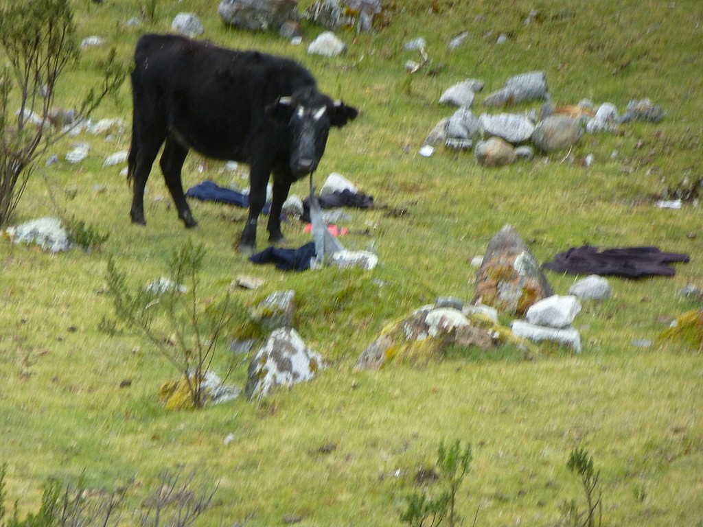 P1040668 26. Mai 2015 1024 × 768 Unterwegs in den Bergen Während wir am Gletschersee unsere Brotzeit hatten, hat sich diese Kuh über die zum trocknen zurückgelassene Kleidung gefreut. Waren zum Glück nicht meine Sachen..