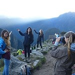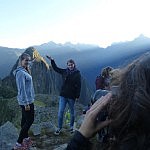 Fotoapparate werden gezückt und es wird versucht möglichst ein Bild ohne die vielen Besucher zu machen, die gleich die ganze Ruine stürmen. Also wird gepost, geküsst, gesprungen und der Berg „gestreichelt“. Ein paar übertreiben es wirklich, aber ich kann keinem verübeln, das man doch auch gerne ein schönes Foto mit Machu Pichu hat. Nach einer Weile beschließen wir dem Spektakel einfach nur zu zusehen und die Bühne zu räumen, denn die Sonne geht gleich auf und die ersten Strahlen werden in das Tal fallen. Sieht auf den Fotos jetzt endlich besser aus als in Wirklichkeit. Muss ja aber keiner wissen…