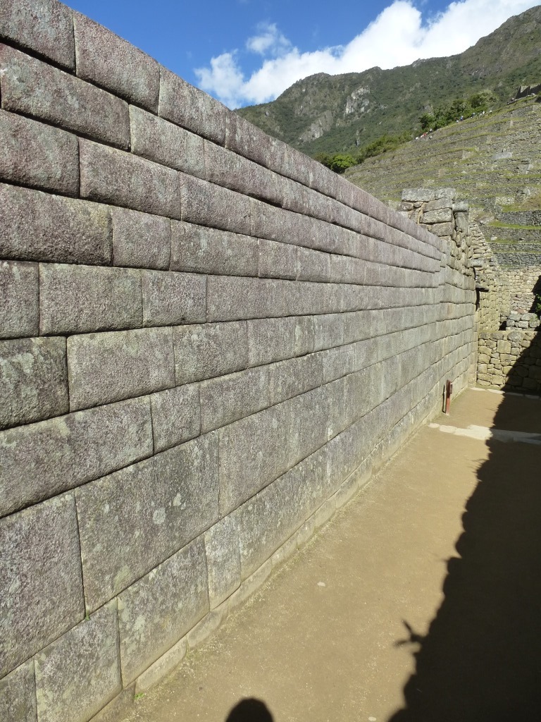 P1050086 8. Juli 2015 768 × 1024 Machu Pichu In den Gebäuden mit den perfekten geraden Linien haben die Inka gewohnt. Das waren die Herscher im System. In den anderen Häusern hat die normal Bevölkerung gewohnt.