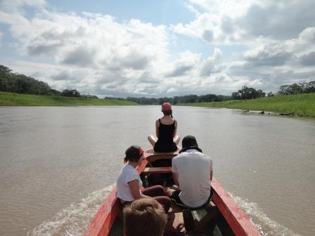DSC05961 8. Dezember 2015 448 × 336 Regenwald Eine der langen Fahrten mit dem Boot in der Mittagshitze. Deswegen habe ich (rechts in weis) auch ein Cap mit Nackenschutz auf.