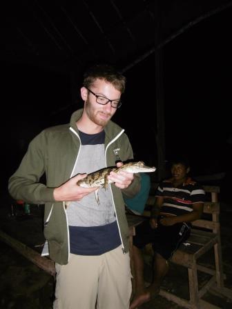 P1000350 8. Dezember 2015 336 × 448 Regenwald Hab gerade einen Alligator gefangen. Mit den Worten kam Juan zu uns ans Abendessen. War nur ein sehr kleiner aber immerhin.