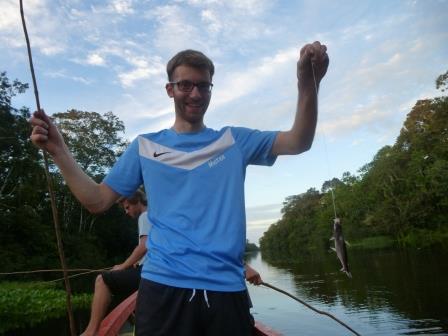 P1050711 8. Dezember 2015 448 × 336 Regenwald Mein erster selbstgefangener Fisch. Etwas klein, dafür eine Delikatesse.