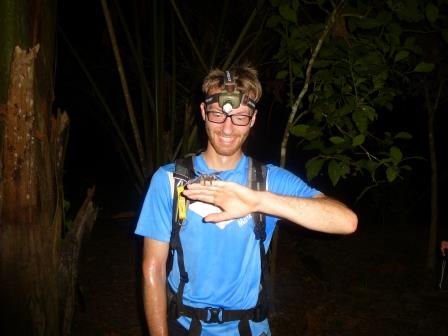 P1050820 8. Dezember 2015 448 × 336 Regenwald Während die eine es sich auf meinem Rücken bequrm gemacht hatte, hier noch ein Bild mit einer Spinne, die lieber im Rampenlicht steht.