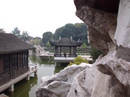 Das gleiche Verhalten konnten wir auch am nächsten Tag beobachten, als wir in Richtung Westen zu einer Tempelanlage aufbrachen. The Divine Hill war eine kleine Anlage, die wir für 20 RMB bestaunen durften. Vor allem waren wir aber über die wenigen Menschen verwundert, die über die verschlungenen Wege wandelten und sich vor blühenden Bäumchen und Sträuchern fotographierten. Die Parks in China beruhen oft auf der Feng-Shui-Tradition, in der Naturgeister eine große Rolle spielen. Daher werden zum Beispiel Brücken zu Pavillons nicht gerade gebaut, sondern mäandern – Geister können nicht passieren, weil sie nur geradeaus gehen können. Außerdem sind viele „Felsen“ aus Steinen zusammen „geklebt“ und stammen ursprünglich aus dem Taihu-See.