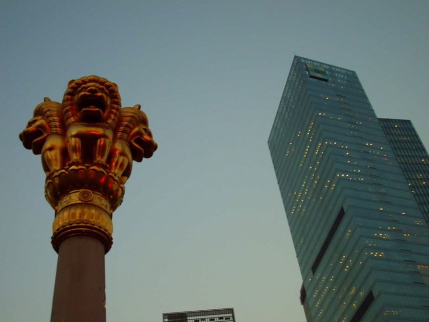 Der Tempel, den wir im Park suchten, schien jedoch auf ein Mal verschwunden zu sein – bis wir am Ende des Parks ankamen. Ein Schild kündigte an, dass wir die Anlage verlassen, mit unseren Tickets aber wieder hineinkämen. Weiter bergauf trafen wir plötzlich auf die vertrauten Menschenmassen. Jugendliche, Familien, Rentner, Paare – alle Welt stieg die Stufen zum Tempel hinauf. Die eine oder andere Chinesin hing am Arm ihres Mannes – zu hoch waren ihre Schuhe, zu ungesund sahen ihre Absätze aus. Sie hatten einfach den kostenlosen Weg um den Park herum gewählt. Als wir oben ankamen, nahmen wir eine unkonventionellen Weg in die Tempelanlage hinein – durch den Hintereingang, wo auch der Lastenaufzug von ganz unten mündete. Prompt wurden wir von einem Mönch in die Anlage gescheucht, wo es nach Räucherstäbchen roch. Viele Chinesen beten zu verschiedenen Göttern, je nach Lebenslage und Bedarf. Manche beten zu dem Gott, der für Geburtsjahr zuständig ist, andere zu allen. Im Tempel selbst begegneten wir den vier Windkönigen, von denen zwei immer böse schauen. Jedoch sind sie nicht per se böse, sondern sollen einfach nur Feinde abschrecken. Für mich waren sie wieder ein Mal ein Beispiel chinesischen Denkens: Es gibt immer eine zweite oder dritte Intention hinter dem Offensichtlichen.