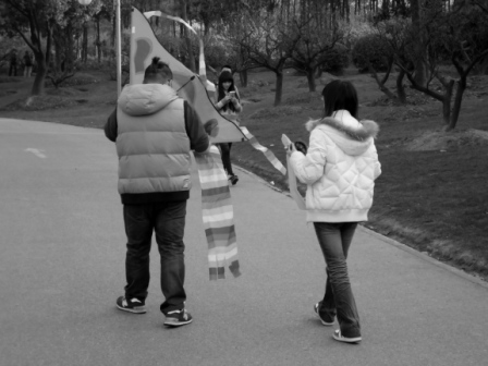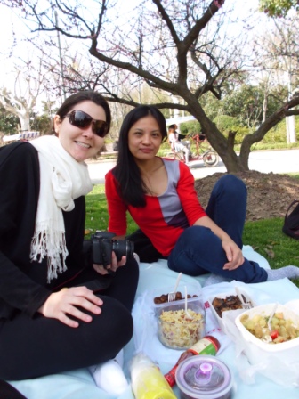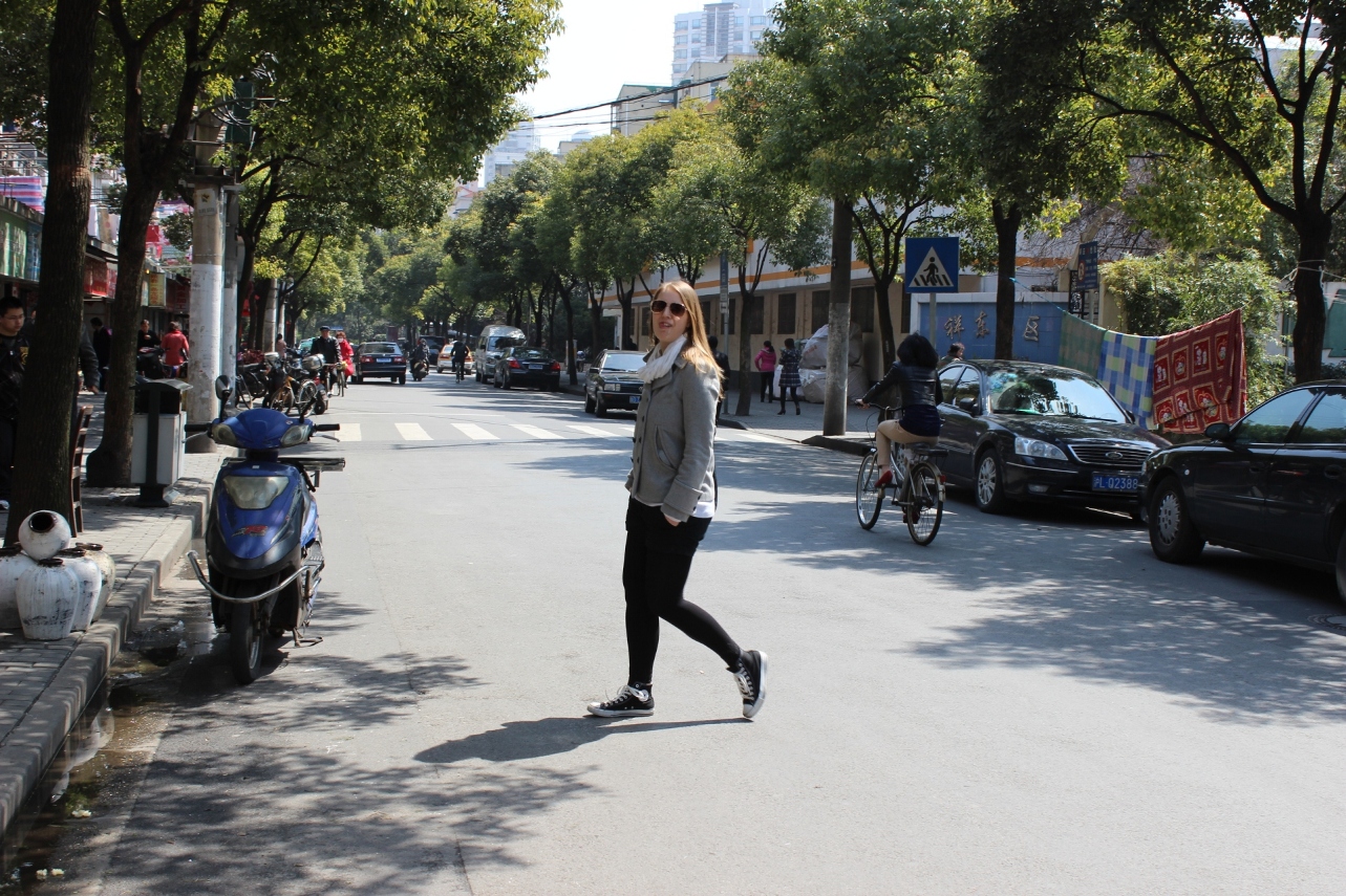 Schließlich fuhr der Zug los und aus der andauernden klassischen Klaviermusik, die auch im Bahnhof zur Beruhigung der Passagiere dienen sollte (?), wurde langsam klassisch chinesische Harfen- und Violenenmussik. Eigentlich wollte ich die Stunde zum Rekapitulieren und Schreiben nutzen, nach einer halben Stunde überwand sich dann aber mein neugieriger Gegenüber mich anzusprechen (er sowie alle anderen direkten Sitznachbarn beobachteten mich ununterbrochen, wie ich mit Füller in mein Tagebuch schrieb). Allerdings auf Chinesisch und ich war total „lost“, was mir widerum sehr peinlich war und ich jegliches Vokabular vergessen hatte. Zum Glück hatte ich mein Chinesisch-Buch dabei und las stupide die aus dem Chinesisch-Unterricht notierten Sätze vor. Die restliche Zeit war so schnell vergangen und ich habe mindestens den halben Zug amüsiert, denn alle sperrten Augen und Ohren auf wie die blonde Ausländerin versuchte, ihre Sprache zu… artikulieren. Als ich ihnen dann auch zu verstehen gab, dass ich nicht wüsste, wo die Taxis in Suzhou abfahren (zum Glück hatte mir Johanna die Adresse vorher geschickt und ich zeigte ihnen, wo ich eigentlich hinmusste), nickte mein älterer Sitznachbar vehement mit dem Kopf. Er kannte die Schule? Er weiß, wo die Taxis abfahren? Er muss auch in Suzhou aussteigen? Ich verstand rein gar nichts, aber offensichtlich musste er auch nach 50 Minuten Zugfahrt aussteigen und nahm mich am Arm. Na, dann lass ich mich mal führen. Natürlich kann man jetzt sagen: Ist das Mädel denn total naiv? Da hätte ja sonst etwas passieren können! Aber in solchen Situationen hab ich die Erfahrung gemacht, dass man auf seinen Bauch hören muss – sonst ist man verloren. Der Vertrauensvorschuss zahlte sich auch aus, weil der Mann mich durch den Bahnhof zu den Bussen führte und schließlich zu den Taxis, mich vor dummen Verlautbarungen chinesischer Jugendlicher „schützte“ und bis zu Johannas Schule brachte (er stieg mit mir aus dem Taxi aus und führte mich am Arm über die große Straße in Johannas Arme, xiéxie!).