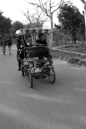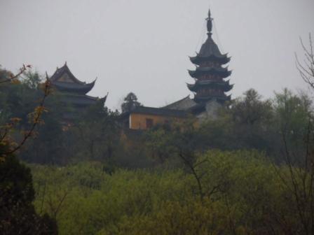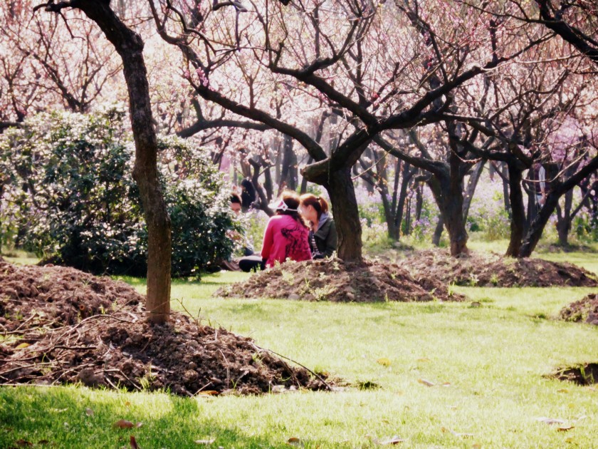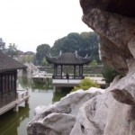 Das gleiche Verhalten konnten wir auch am nächsten Tag beobachten, als wir in Richtung Westen zu einer Tempelanlage aufbrachen. The Divine Hill war eine kleine Anlage, die wir für 20 RMB bestaunen durften. Vor allem waren wir aber über die wenigen Menschen verwundert, die über die verschlungenen Wege wandelten und sich vor blühenden Bäumchen und Sträuchern fotographierten. Die Parks in China beruhen oft auf der Feng-Shui-Tradition, in der Naturgeister eine große Rolle spielen. Daher werden zum Beispiel Brücken zu Pavillons nicht gerade gebaut, sondern mäandern – Geister können nicht passieren, weil sie nur geradeaus gehen können. Außerdem sind viele „Felsen“ aus Steinen zusammen „geklebt“ und stammen ursprünglich aus dem Taihu-See.